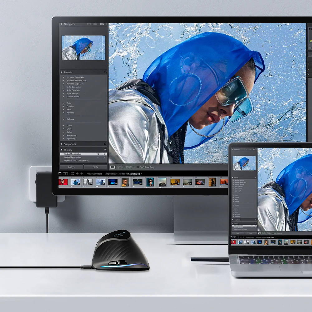 Característica:1.Visualización informativa:El mouse inalámbrico vertical cuenta con una pantalla incorporada que muestra el modo de conexión actual, el nivel de la batería y la configuración de DPI, manteniéndote informado de un vistazo.