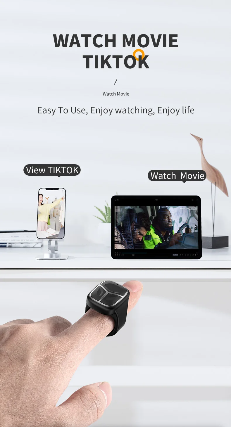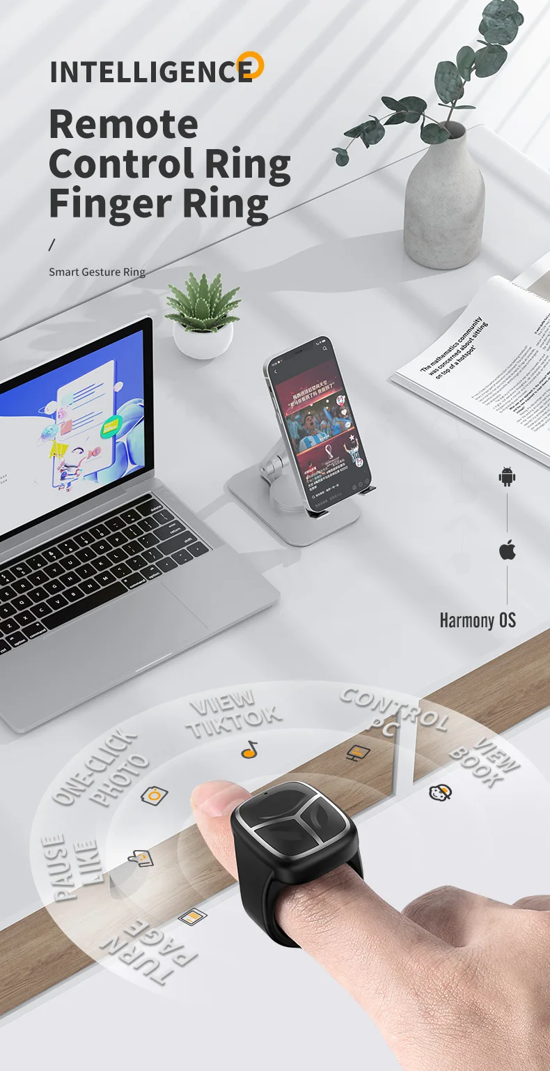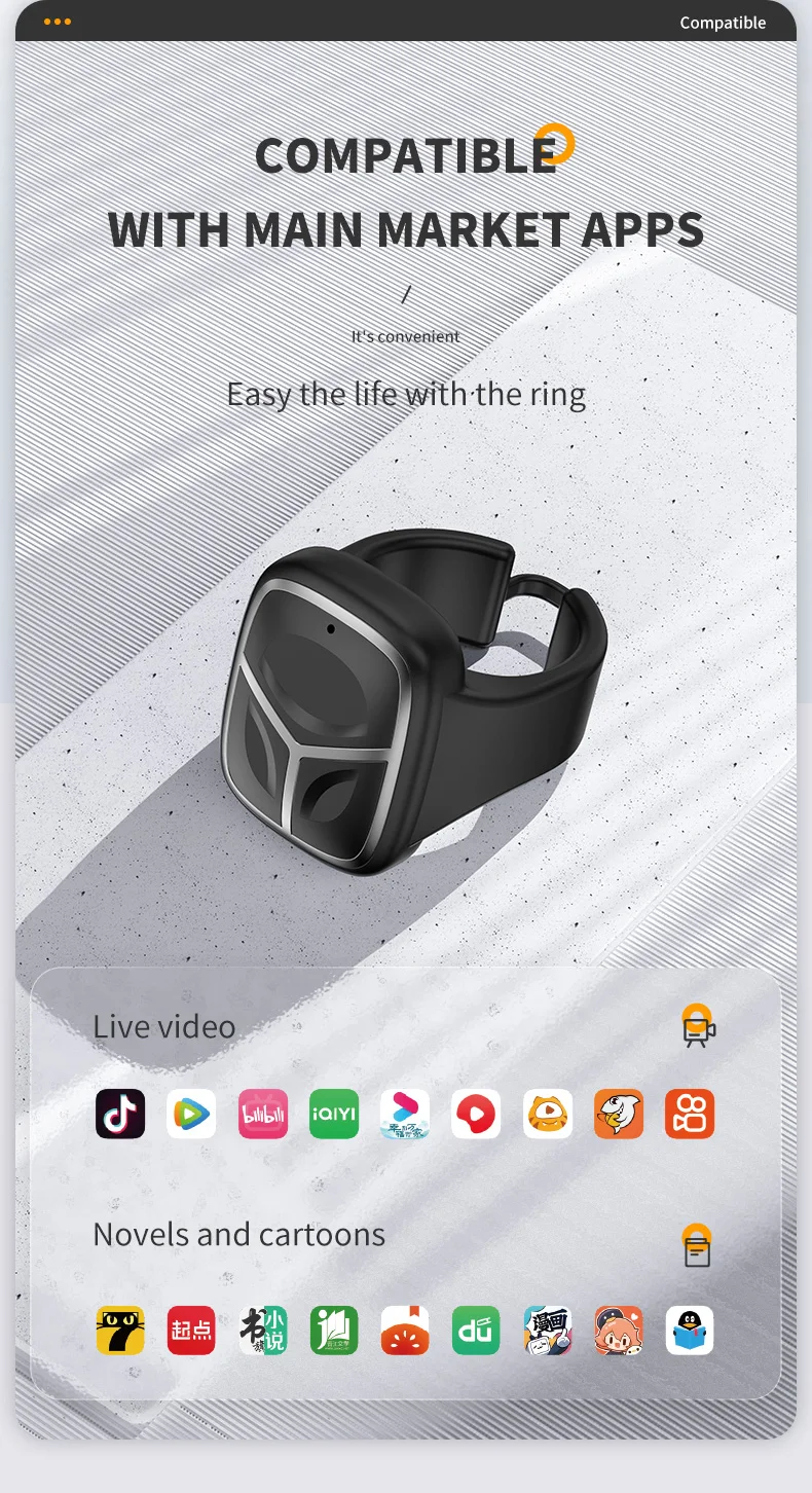 5.Compatibilidad del sistema: el anillo de control remoto es compatible con las aplicaciones convencionales (vídeos cortos, cámaras, novelas, etc.)en el mercado.Es portátil y liviano, y es el mejor compañero para las personas perezosas.Admite la mayoría de los software populares de los sistemas operativos i, Android y Hongmeng.Si desea usarlo en dispositivos IOS, como iPhone y iPad, abra "Configuración" - "Accesibilidad" - "Toque" y active la función táctil de asistencia, que se puede utilizar.