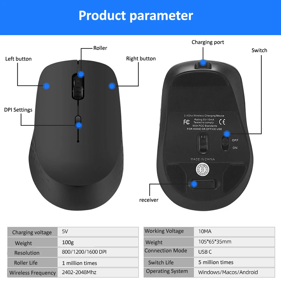Comprar Ratón inalámbrico HKXA tipo C, recargable, silencioso, ergonómico, 3 DPI, ajustable con adaptador USB para ordenador portátil, PC, Macbook