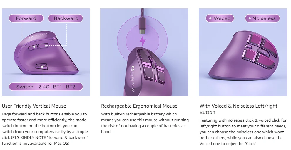 Ratón vertical recargable: viene con una batería recargable incorporada, lo que significa que puede usar el mouse durante un período prolongado de tiempo sin preocuparse por reemplazar las baterías.Es una gran inversión para cualquiera que valore la comodidad y la confiabilidad.