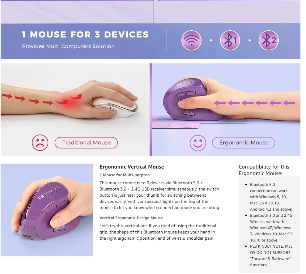 Este mouse se conecta a 3 dispositivos a través de Bluetooth 5.0 + Bluetooth 3.0 + 2.Receptor USB 4G simultáneamente, el botón de cambio está cerca de su pulgar para cambiar fácilmente entre 3 dispositivos, con luces llamativas en la parte superior del mouse para que pueda saber qué modo de conexión está utilizando.