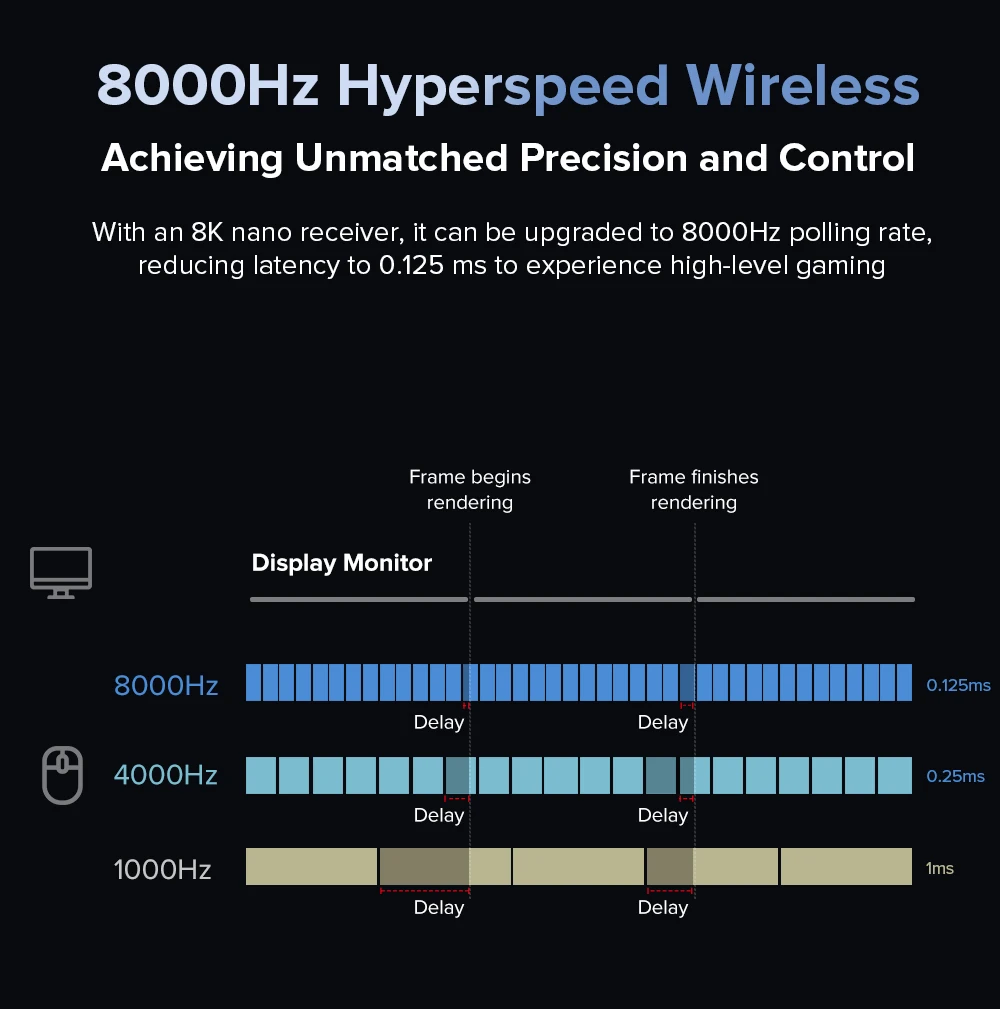 Con un nanocreceptor de 8K, se puede actualizar a una velocidad de sondeo de 8000 Hz, lo que reduce la latencia a 0,125 ms para experimentar juegos de alto nivel.