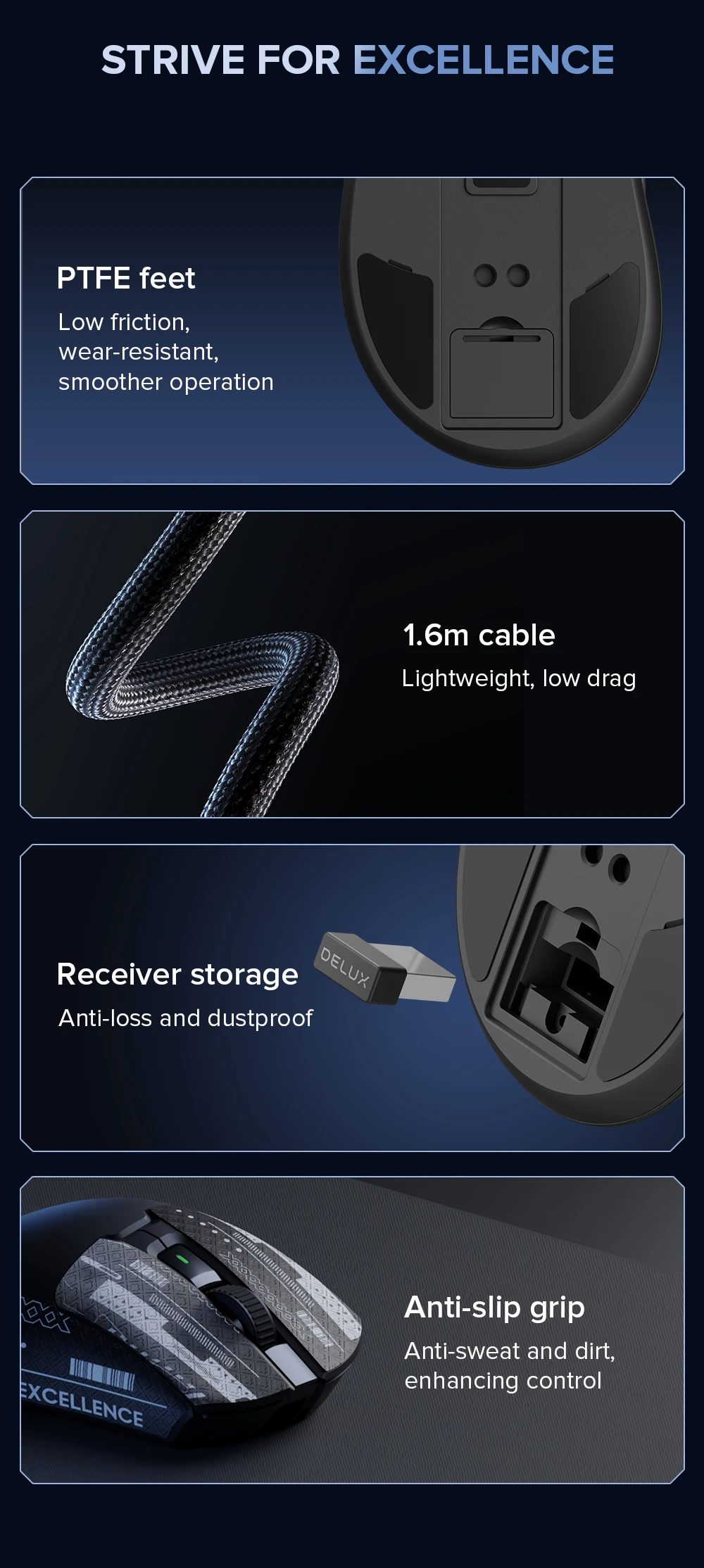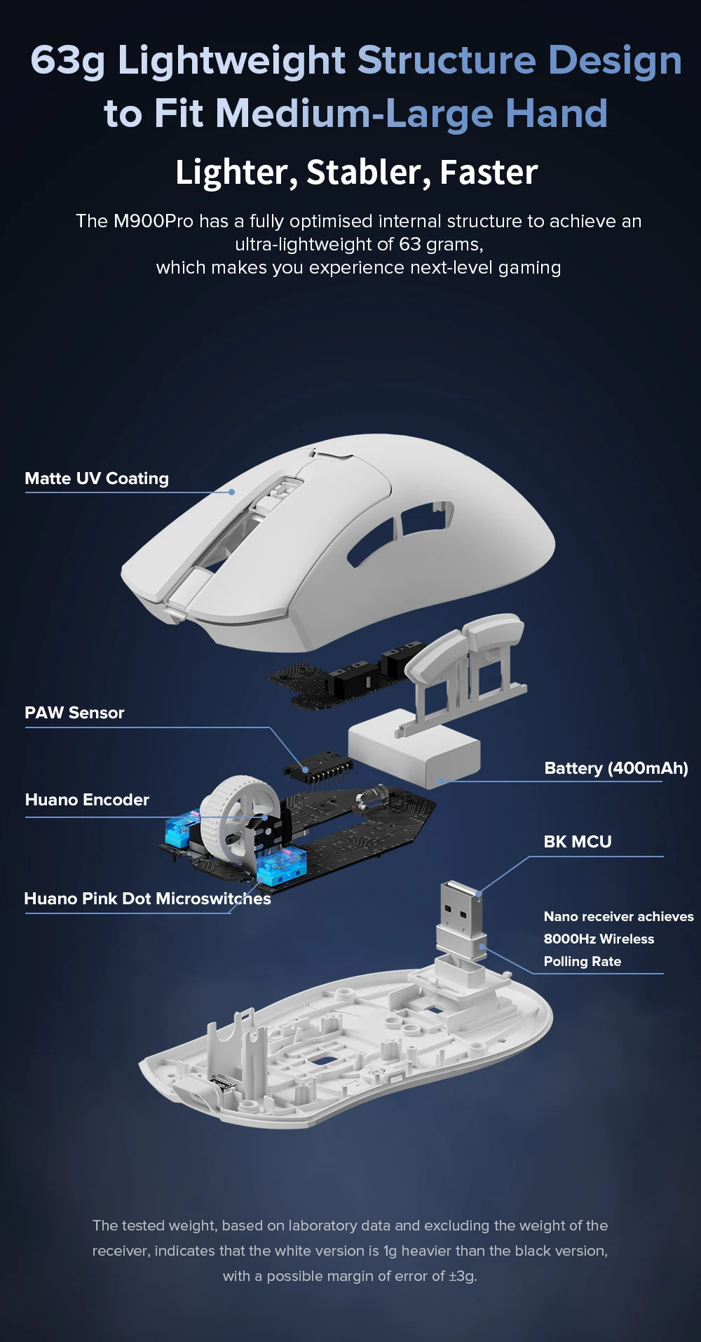 El M900Pro tiene una estructura interna totalmente optimizada para lograr un peso ultraligero de 63 gramos, lo que te hace experimentar juegos de siguiente nivel.