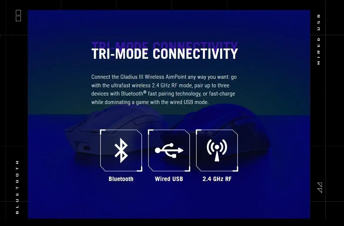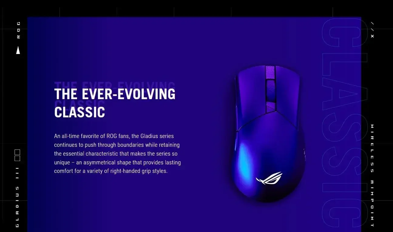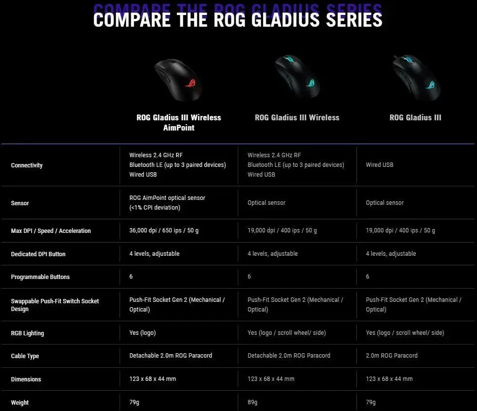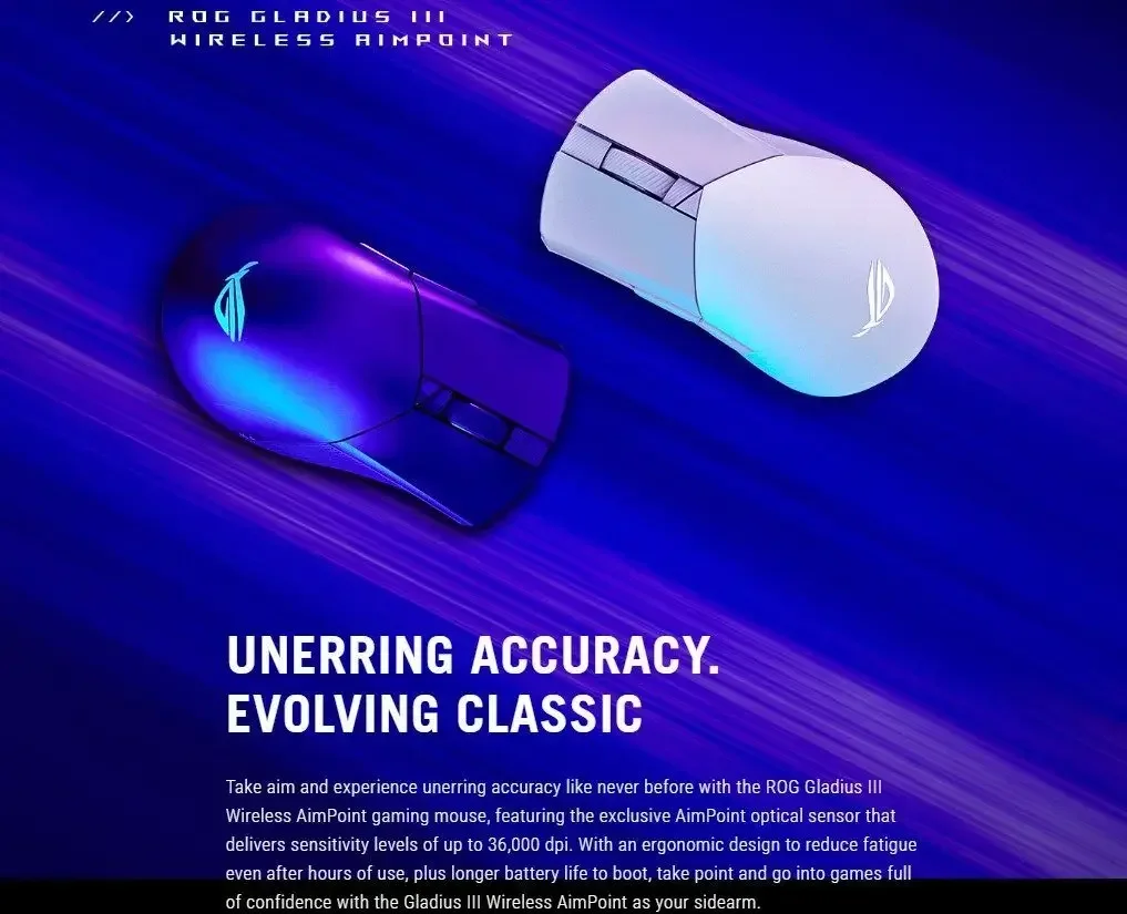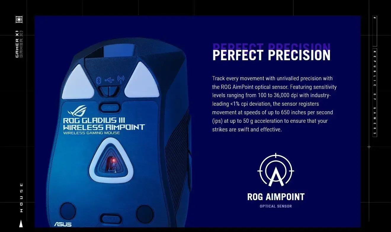 El ROG Gladius III Wireless AimPoint es un mouse para juegos RGB inalámbrico liviano de 79 gramos que cuenta con un sensor óptico ROG AimPoint de 36.000 ppp, conectividad de tres modos, tecnología inalámbrica ROG SpeedNova, interruptores de mouse intercambiables, ROG Micro Switches, mecanismo de botón giratorio para latencia de clic de 0 ms, diseño ergonómico, ROG Paracord, pies de mouse 100% PTFE, seis botones programables y cinta de agarre para mouse.