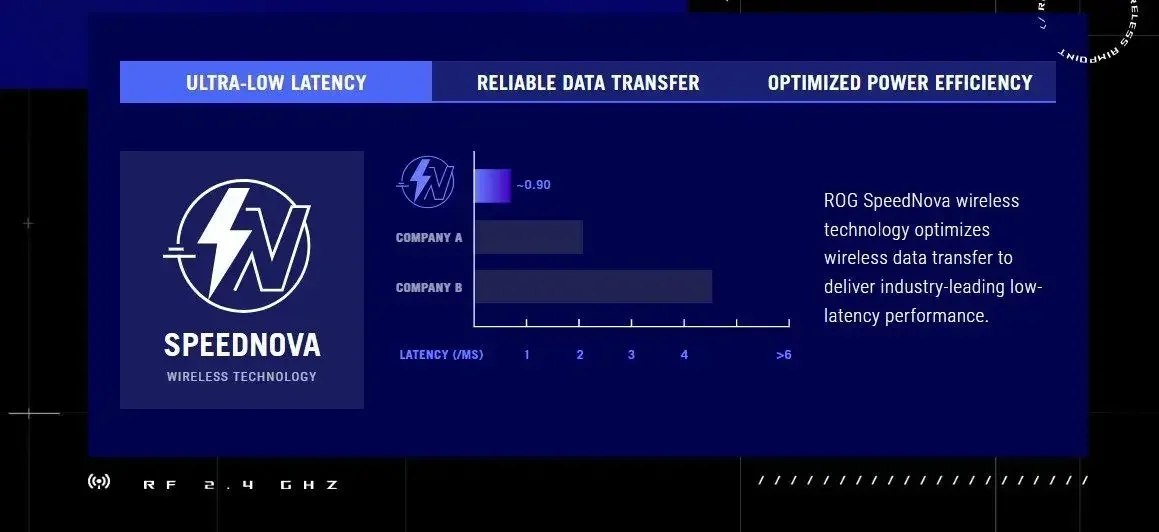 3.Tecnología inalámbrica ROG SpeedNova: ofrece un rendimiento inalámbrico confiable y de baja latencia y una solución de energía optimizada en el modo RF de 2,4 GHz.