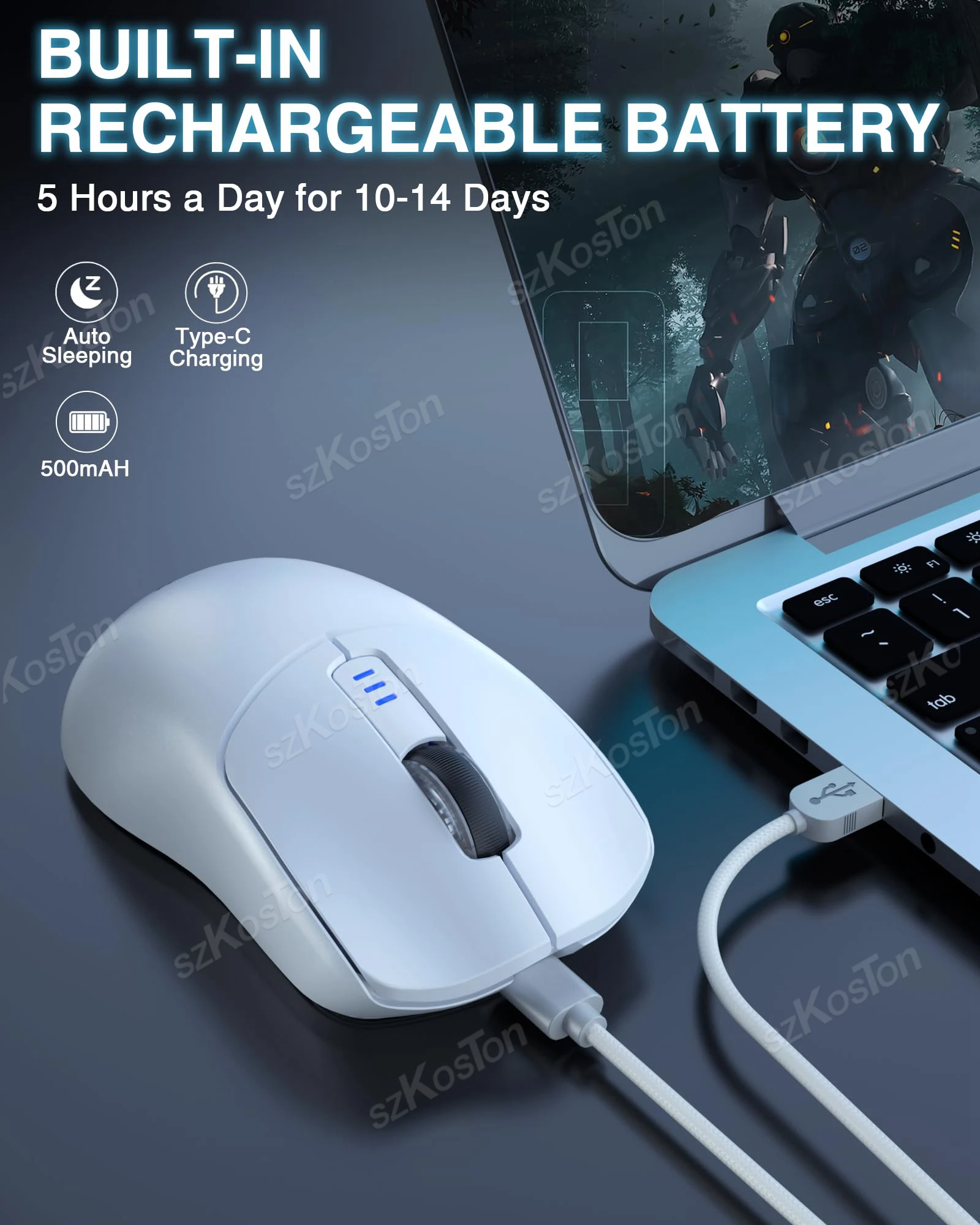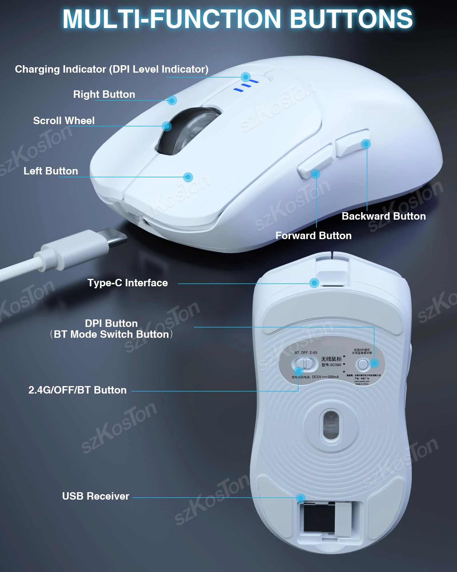NOTA: El controlador de juegos solo admite el sistema Windows y solo se puede usar en modo inalámbrico y cableado USB-C de 2,4 GHz, el modo BT no está disponible Acerca de este artículo Conexión de 3 modos y amplia compatibilidad: el mouse para juegos SC580 viene con tres modos de conexión, conexión inalámbrica 2.4G/2 BT5.0/por cable USB-C, que puede guardar hasta 4 dispositivos al mismo tiempo y se puede cambiar rápidamente mediante el interruptor inferior. botón.El mouse inalámbrico es ampliamente compatible con Windows 7/8/10/XP/Vista, Mac OS, Linux y sistemas Android, adecuado para PC, computadora portátil, Mac y otros dispositivos para satisfacer las múltiples necesidades de los usuarios. 6 niveles de DPI ajustables y alta tasa de sondeo: el mouse inalámbrico para juegos está equipado con 6 niveles de DPI (800/1600/2400/3200/6400/10,000), que pueden ajustarse mediante el software o el botón DPI para mover el cursor a una posición precisa, satisfaciendo las necesidades de diferentes tareas.Con una alta tasa de sondeo de 1000 Hz, el mouse de la computadora maximiza el rendimiento de baja latencia y sin saltos para brindar a los jugadores una experiencia competitiva incomparable.Szkoston 6 botones programables: el mouse inalámbrico para computadora portátil admite edición de macros.Al instalar el software del controlador, puede personalizar los 6 botones según sus hábitos de uso, haciendo que el mouse para juegos inalámbrico sea más inteligente para satisfacer sus diferentes necesidades de juegos y trabajo. Batería recargable y vida útil más larga: batería recargable incorporada de 500 mAh, este mouse inalámbrico recargable puede durar de 10 a 14 días con 5 horas de uso diario.El mouse USB se puede recargar fácilmente mediante el cable USB incluido para un uso sostenible.Con una vida útil más larga de hasta 10 millones de clics, los jugadores pueden disfrutar de un funcionamiento constante y estable.¡El indicador de batería baja parpadea en rojo para recordar a los usuarios que recarguen!Los usuarios pueden configurar el tiempo de sueño profundo apropiado (3-10 min) a través del conductor Diseño ergonómico y pegatinas antideslizantes: el mouse ergonómico está diseñado para usuarios diestros, combinado con un diseño liviano de 82 g, optimiza el peso y la estabilidad del rendimiento, reduciendo la fatiga y la tensión de la mano causadas por largas horas de trabajo y juegos, y mejorando enormemente la eficiencia.Equipado con pegatinas antideslizantes para evitar la grasa y el sudor, puede sostener el mouse inalámbrico ergonómico de forma más fácil y libre.