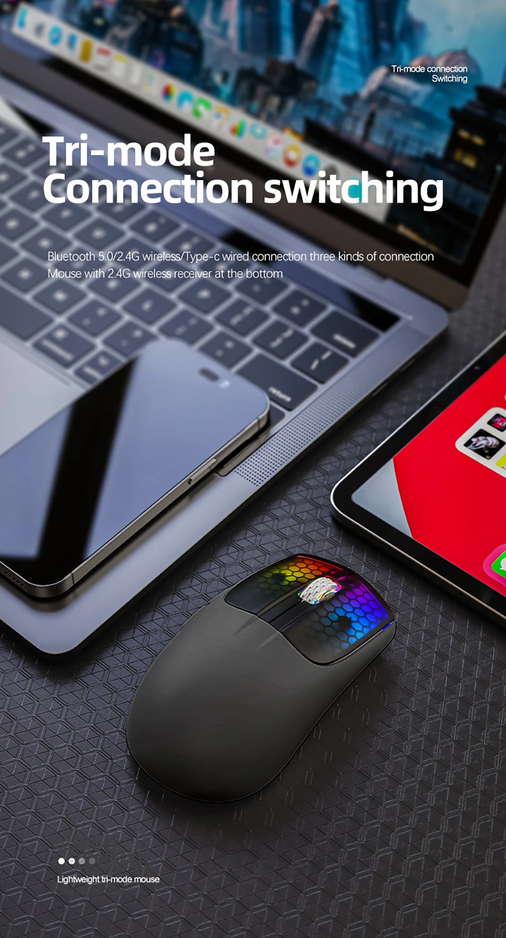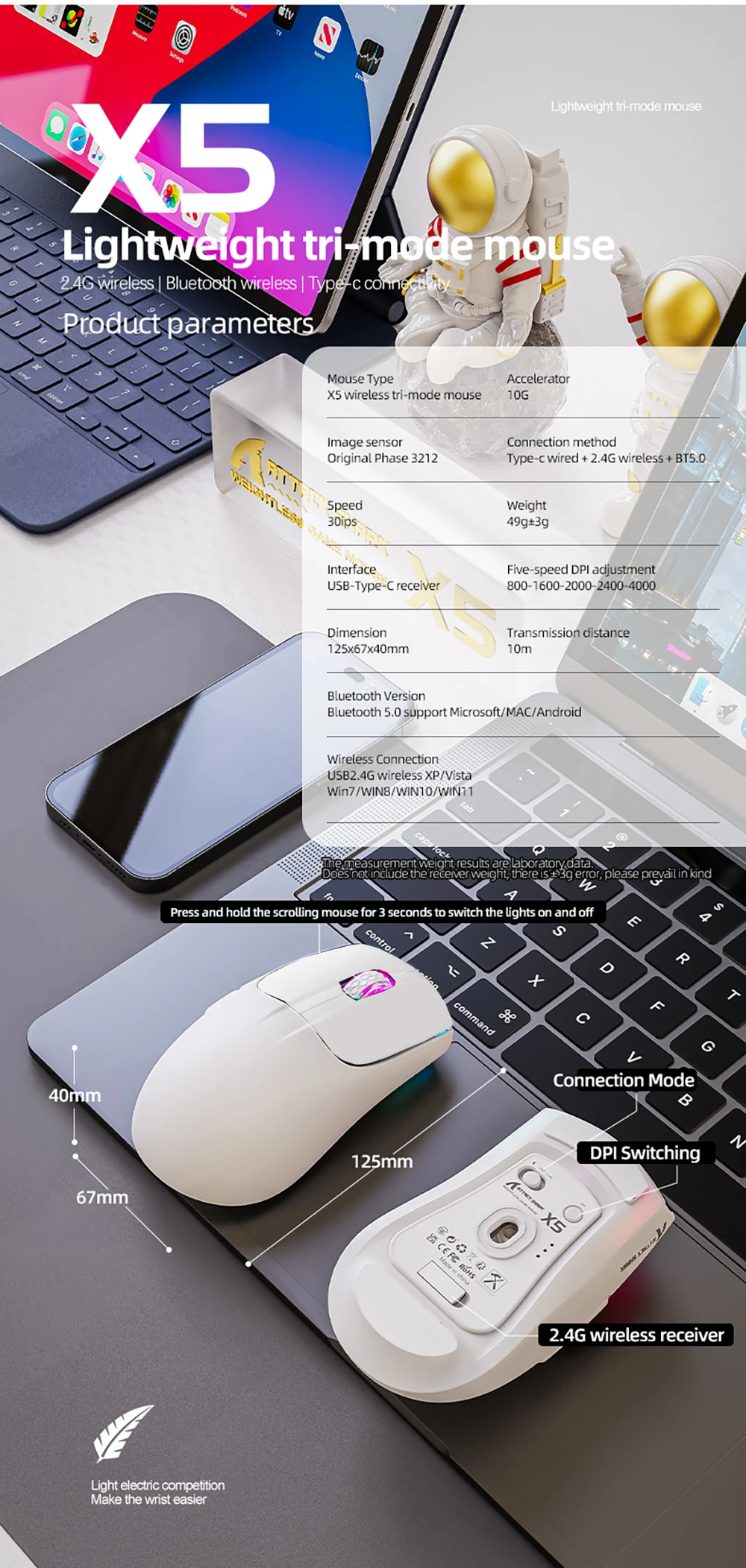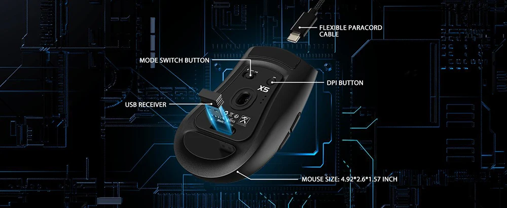 • 3 modos para uso versátil:El ratón viene con 3 modos diferentes, BT/2,4 Ghz/USB-C, lo que le permite usarlo de forma inalámbrica o con un cable.