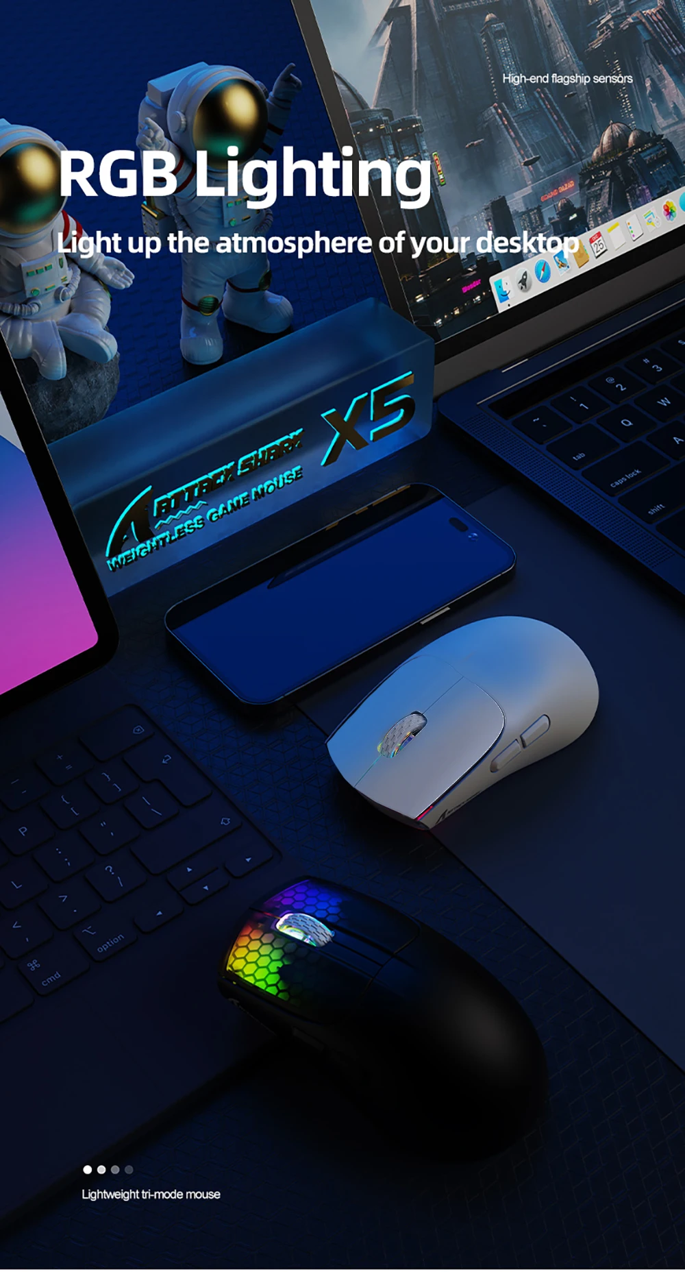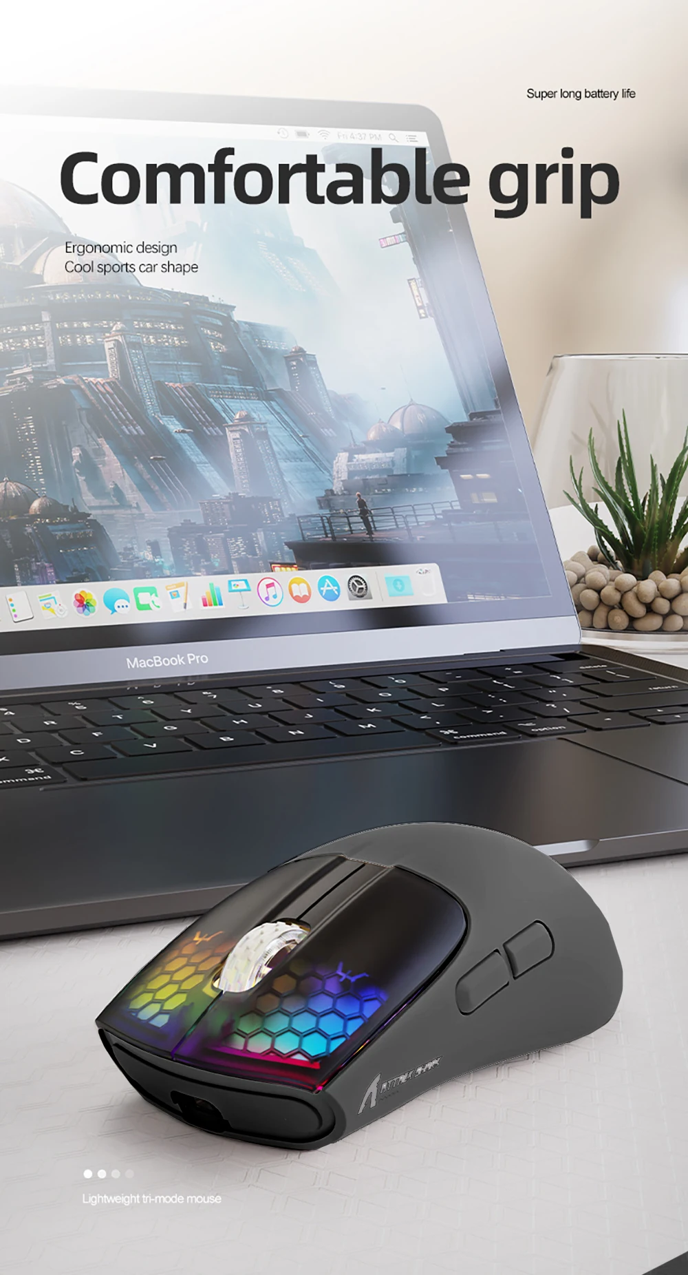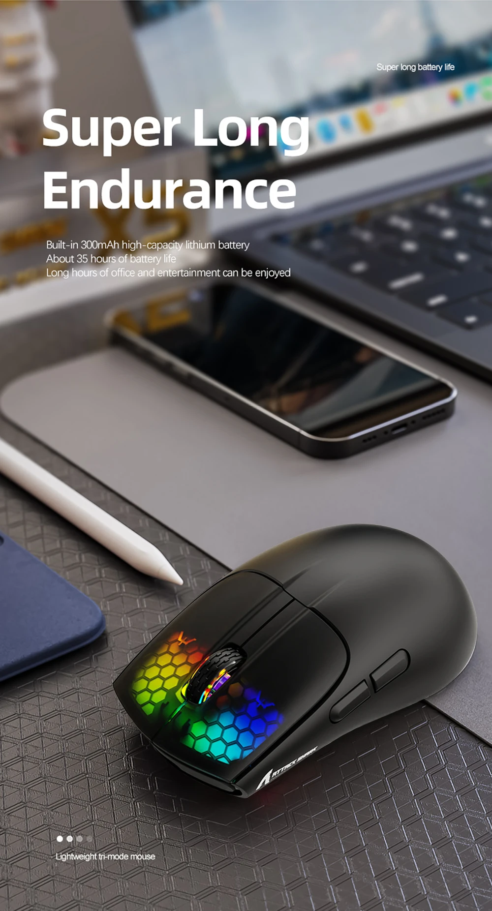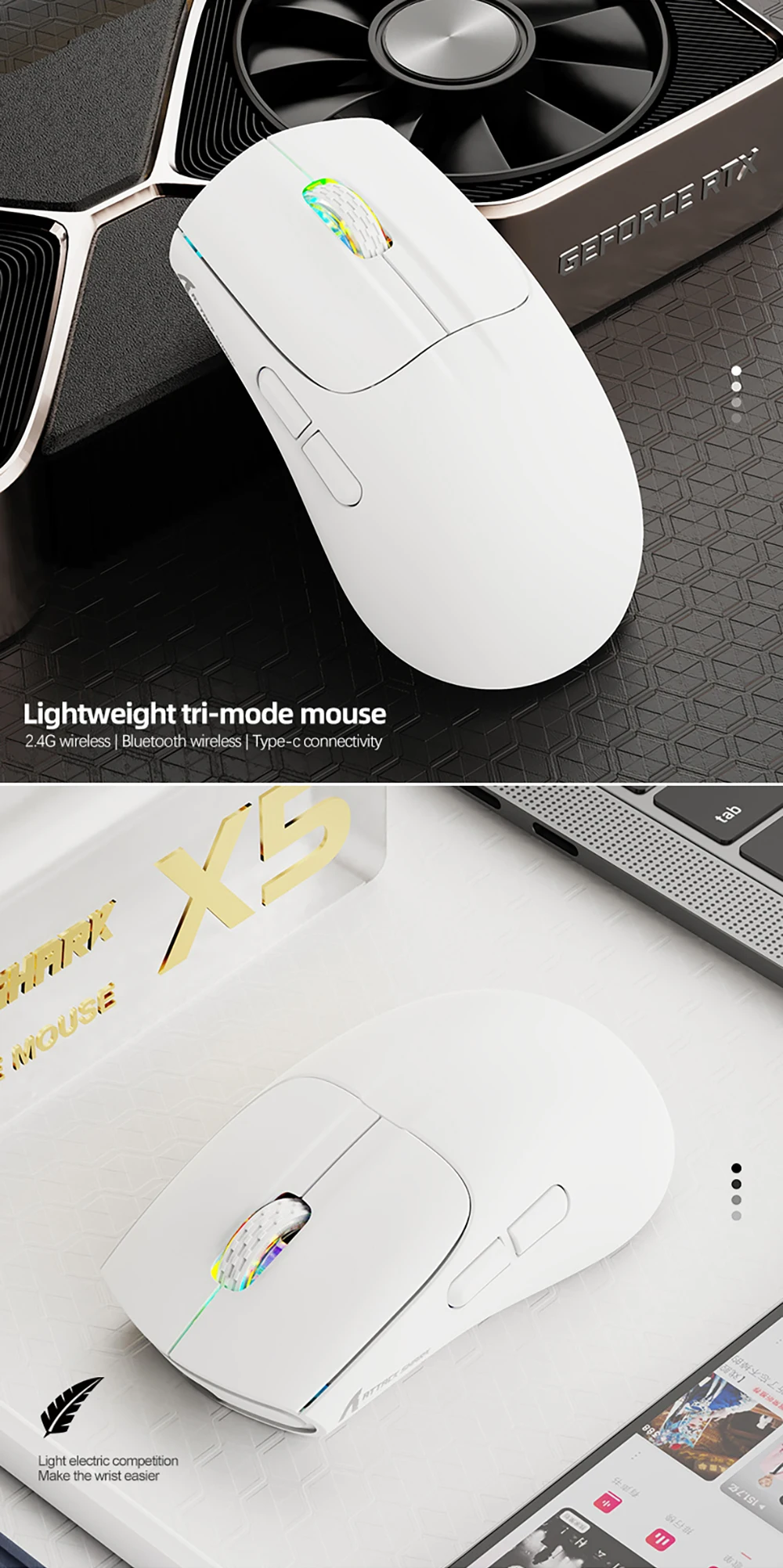 【Respiración RGB Rainbow Backlight】El ratón ATTACK SHARK inalámbrico tiene hermoso LED Rainbow retroiluminado que tiene forma de panal en las teclas correctas y las teclas izquierdas. Nunca esperas que la luz de fondo de un ratón se configure así, es increíble. Definitivamente se sentirá atraído por este diseño.