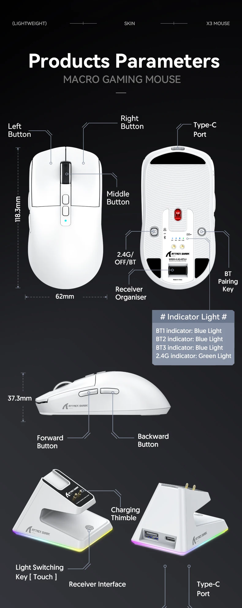 Comprar Ratón inalámbrico ligero para juegos Attack Shark X6 con 3 modos de hasta 26K DPI RGB Base de carga con retroiluminación para ordenador portátil Deskbtop