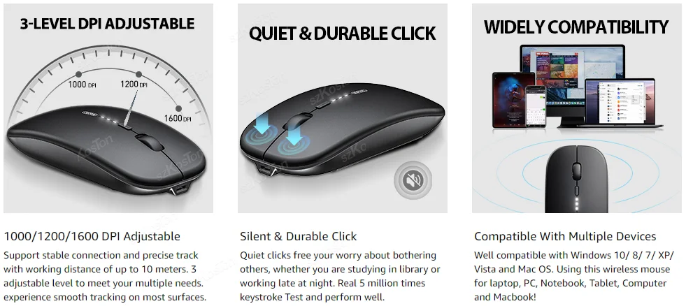✔[Clic silencioso y duradero] Trabaje silenciosamente sin molestar a los demás con el sensor avanzado que reduce el ruido de clic hasta en un 90%. Concéntrese en sus tareas, de día o de noche, sin molestar a los demás. (Tenga en cuenta que solo las teclas principales izquierda y derecha permiten un clic silencioso).