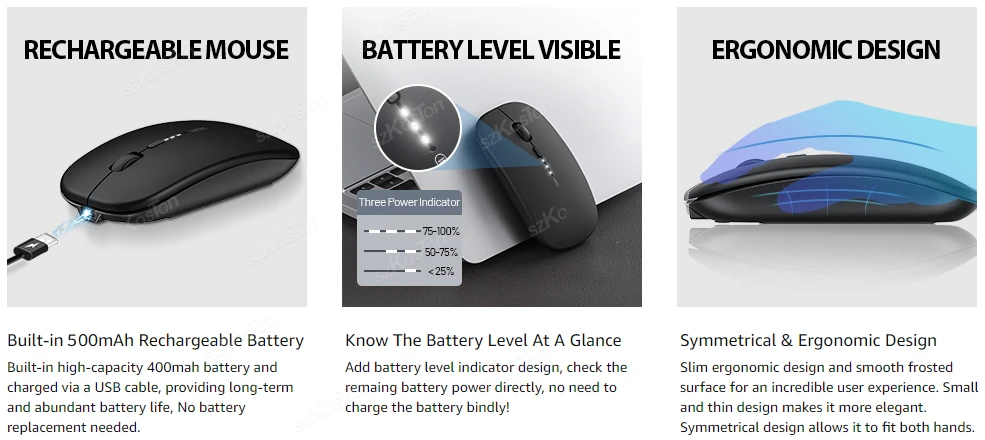 ✔[Diseño elegante y portátil] Diseñado para la comodidad, nuestro ratón inalámbrico ultradelgado es ligero y fácil de transportar. Cabe cómodamente en la bolsa de su portátil, por lo que es ideal para viajar. Tenga en cuenta que el nanoreceptor se coloca en la parte posterior del ratón. Szkoston