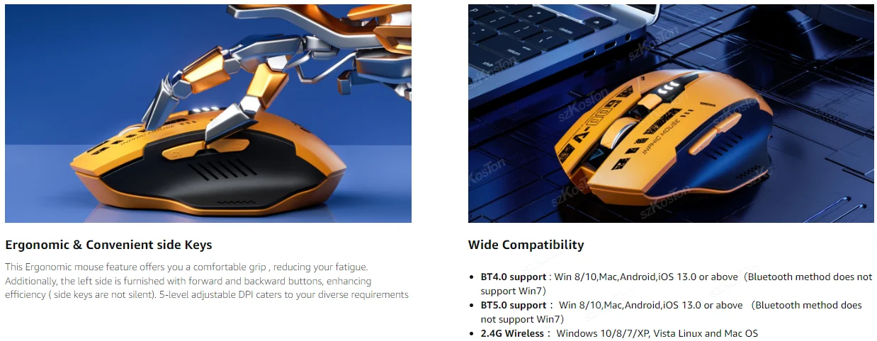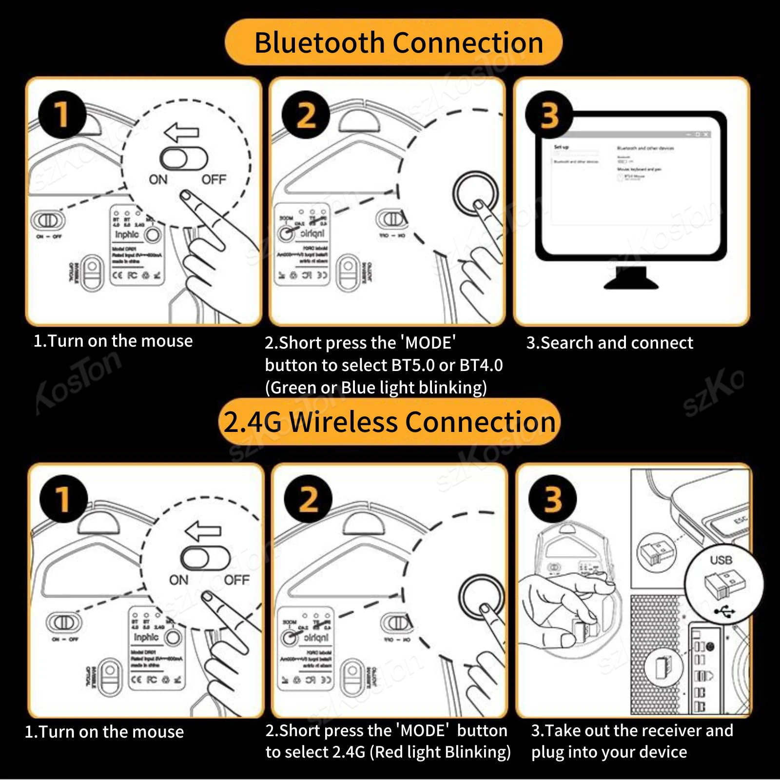 Conectividad de modo triple: este mouse bluetooth admite tres modos de conexión (BT5.0/BT4.0/2.4G), que ofrece amplia compatibilidad con computadoras de escritorio, portátiles y tabletas, lo que le permite cambiar sin esfuerzo entre múltiples dispositivos según sus preferencias