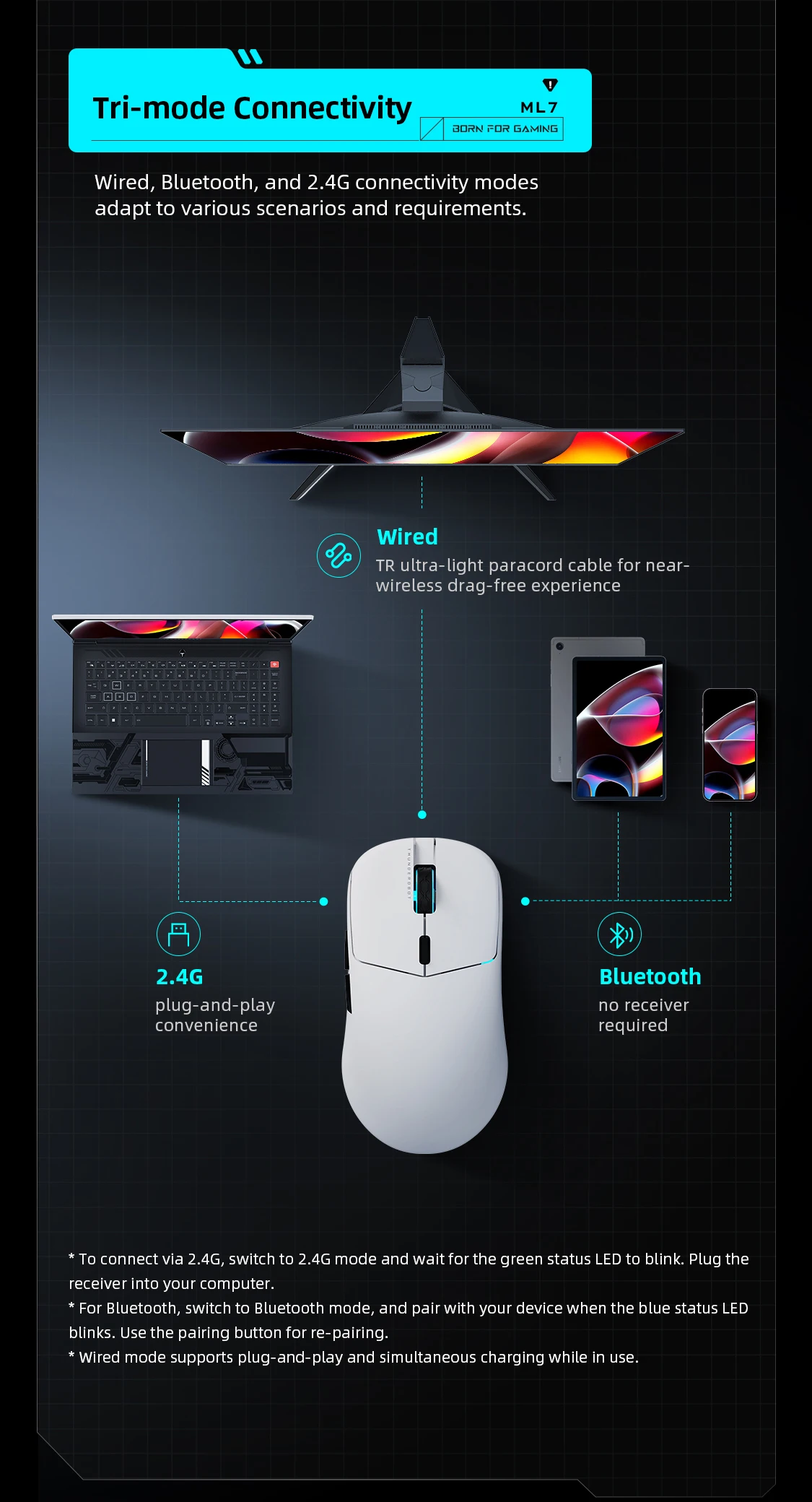 Los modos de conectividad por cable, Bluetooth y 2,4G se adaptan a diversos escenarios y requisitos.