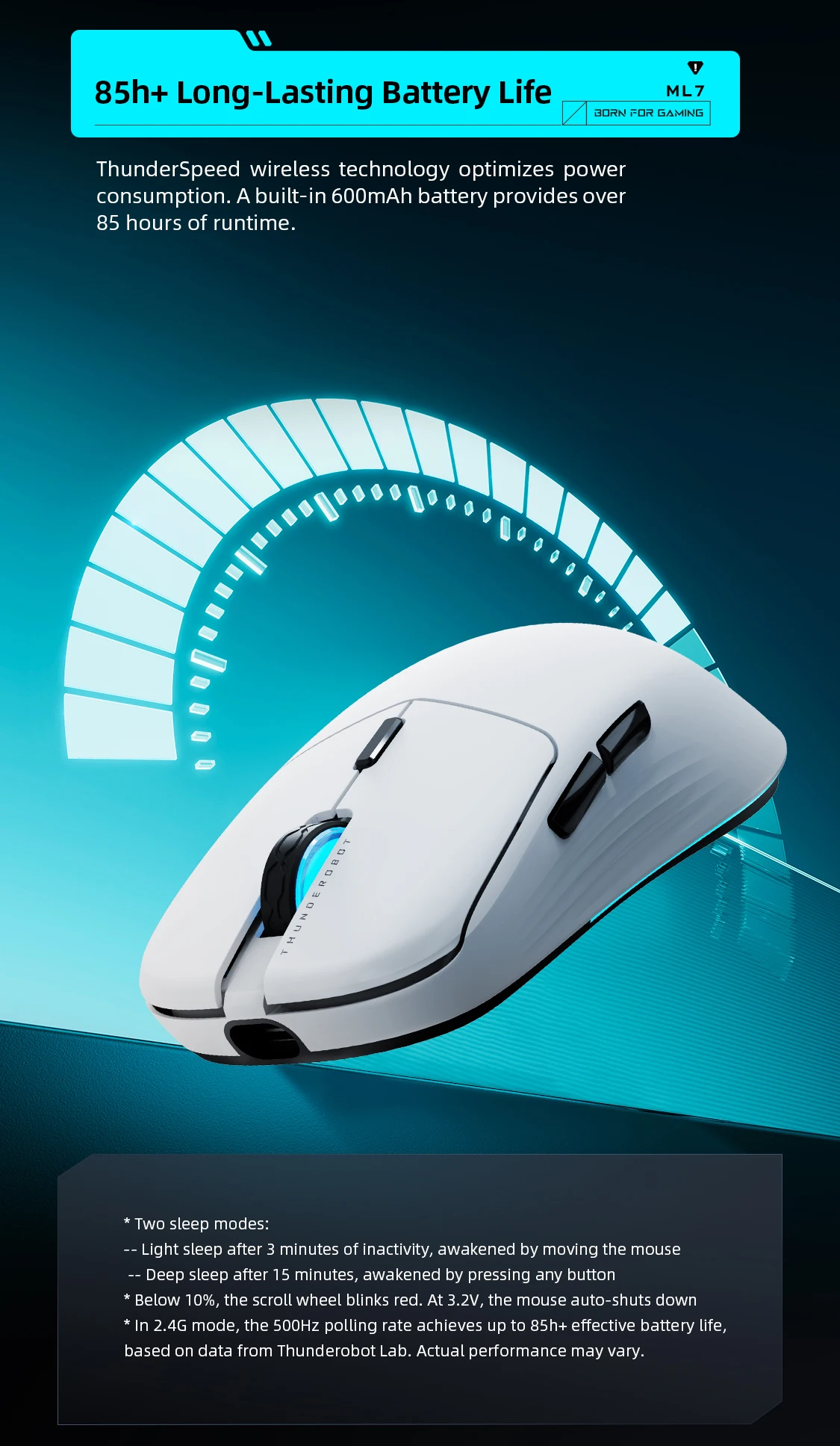 La tecnología inalámbrica ThunderSpeed optimiza el consumo de energía. Una batería incorporada de 600 mAh proporciona más de 85 horas de funcionamiento