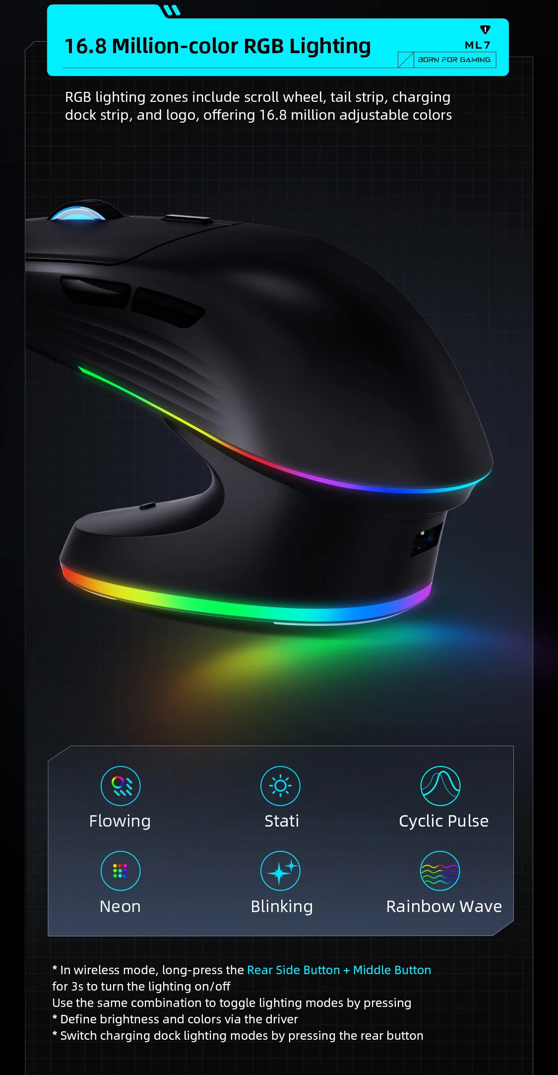 Las zonas de iluminación RGB incluyen rueda de desplazamiento, tira trasera, tira de carga y logotipo, y ofrecen 16,8 millones de colores ajustables.