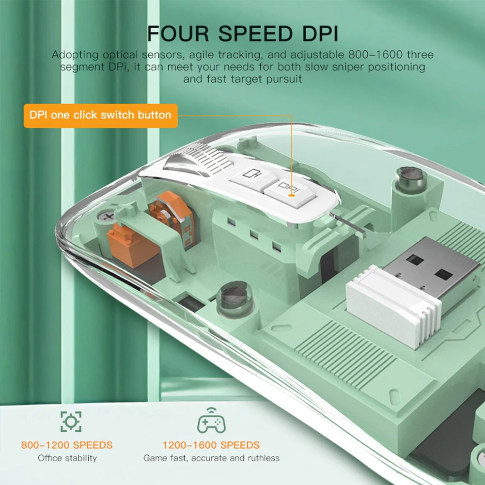 4. Indicador de engranaje DPI: la luz del LOGO parpadea (parpadea en rojo para nivel 1 de 800 ppp; parpadea en verde para nivel 2 de 1200 ppp; parpadea en azul para nivel 3 de 1600 ppp; flashes morados para 2400 DPI nivel 4)