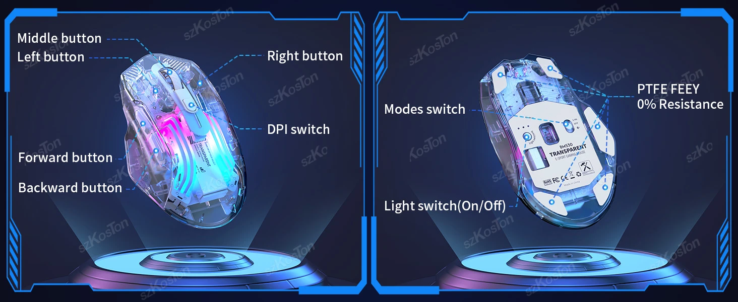 【Ergonómico y cómodo】 Entendemos la importancia de la comodidad durante largas sesiones de juego.Es por eso que nuestro mouse para juegos presenta un diseño ergonómico que se adapta perfectamente a su mano, lo que reduce la fatiga y proporciona un agarre óptimo.La superficie lisa y los botones silenciosos mejoran aún más la experiencia general del usuario, mientras que el cuerpo transparente agrega un toque elegante y moderno.
