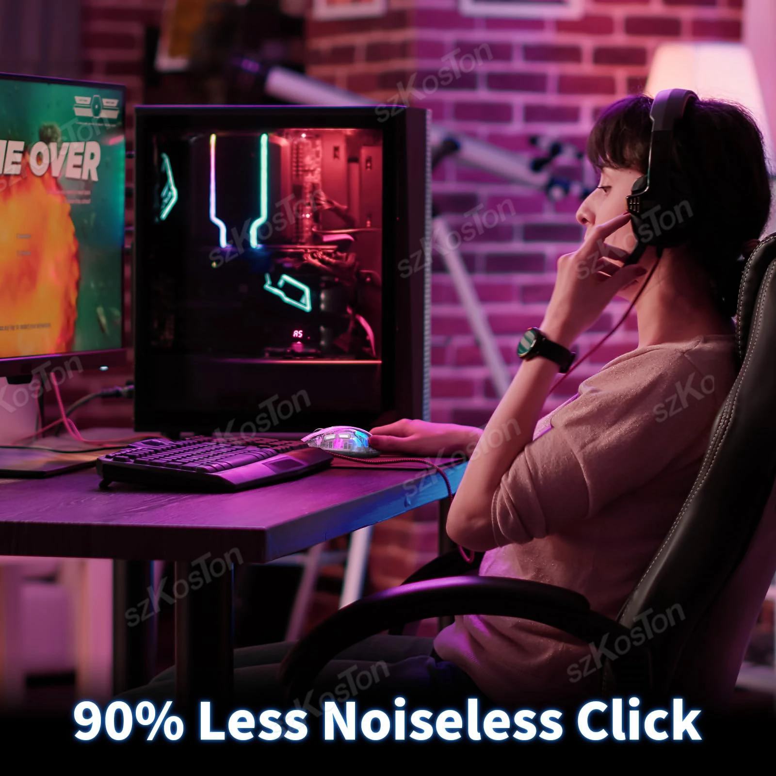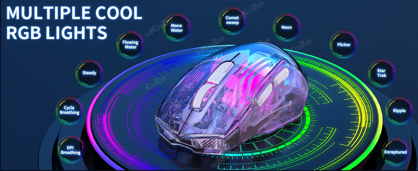 【Iluminación 11 RGB personalizable】Lleve su configuración de juego al siguiente nivel con los 11 efectos de luz RGB en nuestro mouse para juegos.Elija entre una amplia gama de colores y modos de iluminación para crear una atmósfera personalizada que combine con su estilo de juego.El diseño transparente también añade un toque de estética futurista.