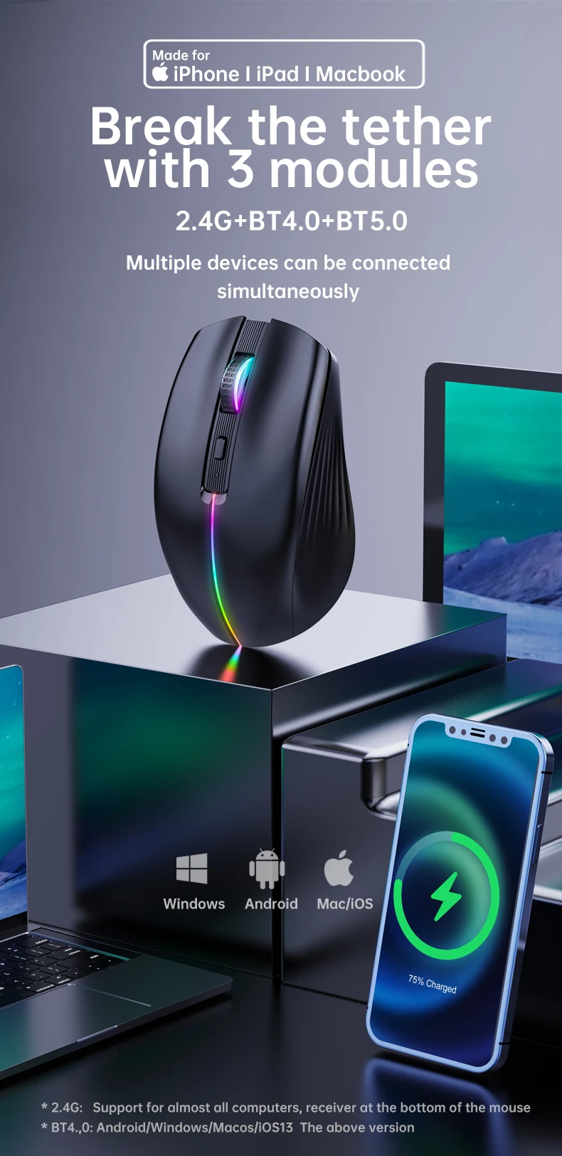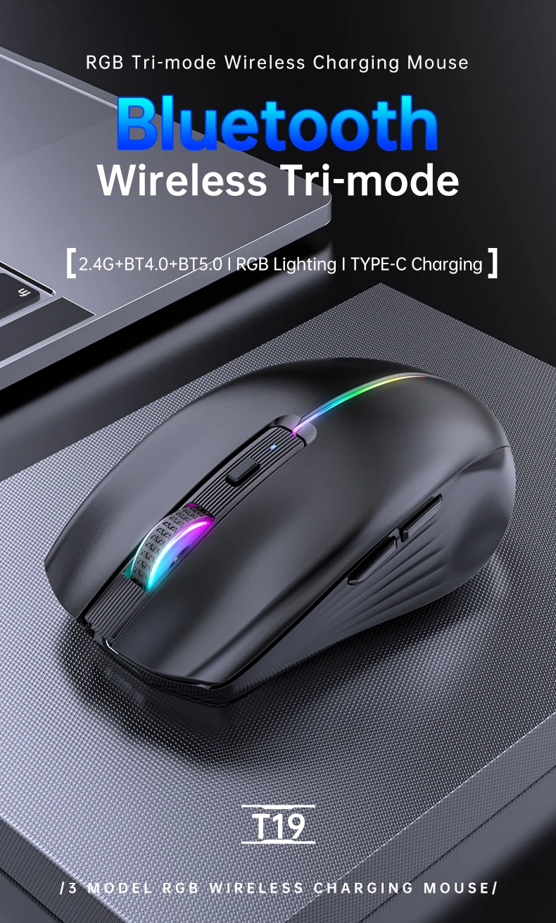 Comprar Ratón inalámbrico trimodo con Bluetooth 2,4 + 4,0, 5,0G, recargable, botón silencioso, retroiluminación RGB, ligero, portátil, uso en oficina