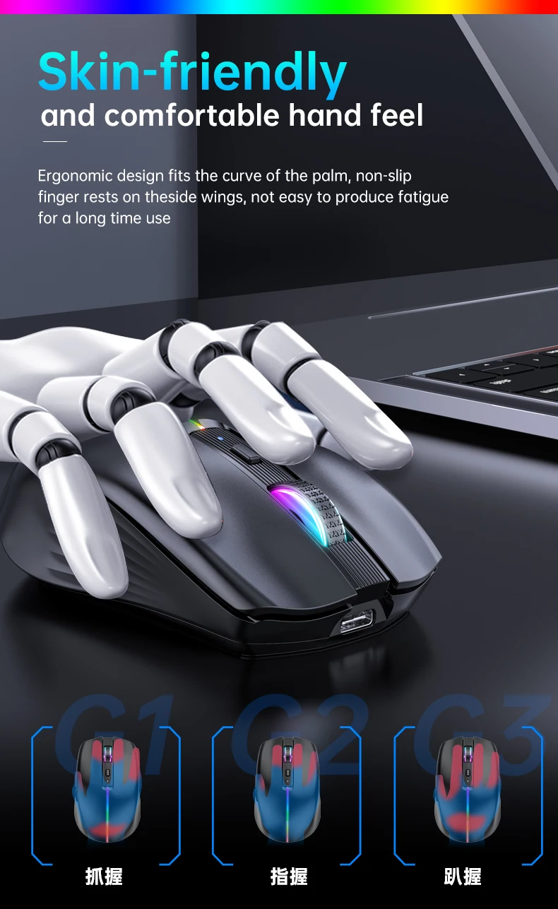 Ratón inalámbrico tri-modo 2,4G Bluetooth 4,0 + 5,0 Botón de silencio recargable Mause RGB Retroiluminación Peso ligero Uso de oficina portátil