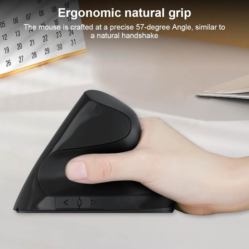 1.Agarre natural ergonómico: El mouse inalámbrico vertical está diseñado con un ángulo preciso de 57 grados que imita una posición natural del apretón de manos, brindando comodidad durante todo el día.Este diseño innovador reduce significativamente la fatiga del antebrazo, aumentando su productividad y comodidad.