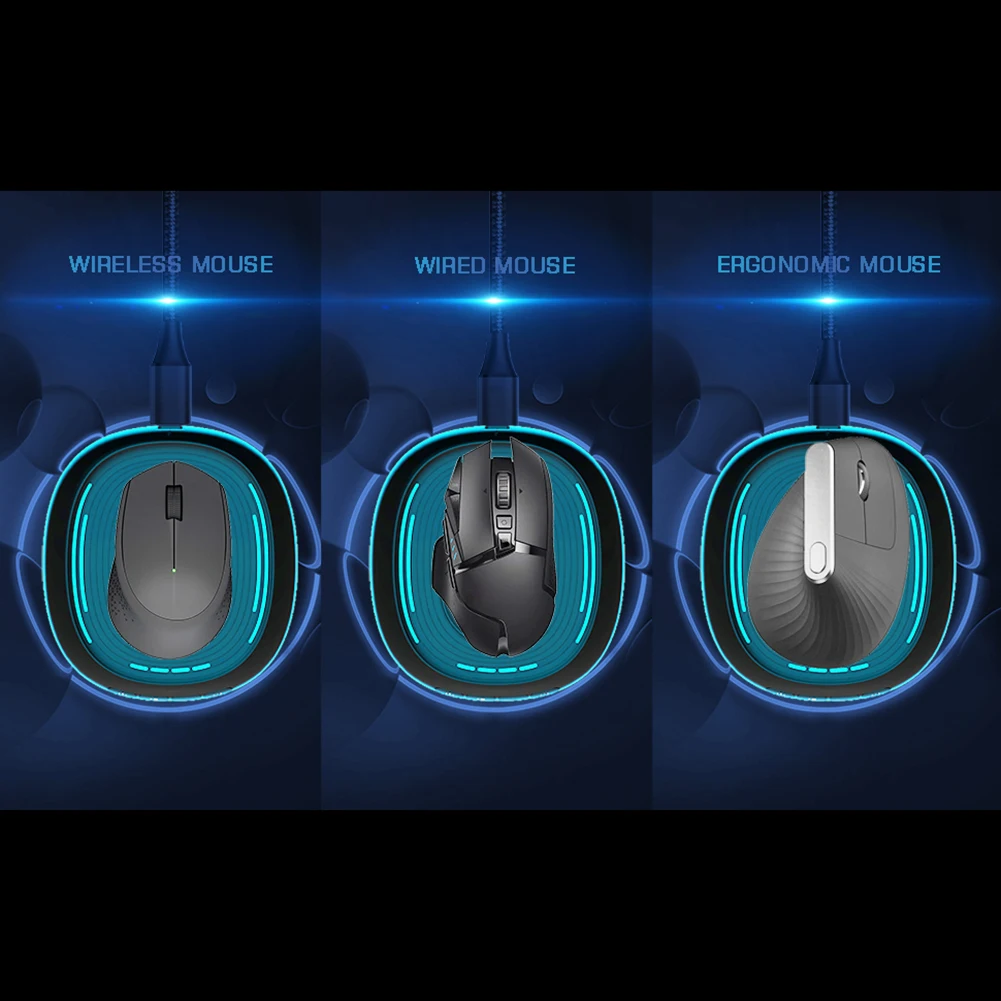 2. Estructura silenciosa:Motor silencioso incorporado, sin contacto con la plataforma giratoria del ratón. La parte inferior está soportada por una serie de almohadillas de silicona para evitar resbalones y evitar la transferencia de vibraciones a la mesa.