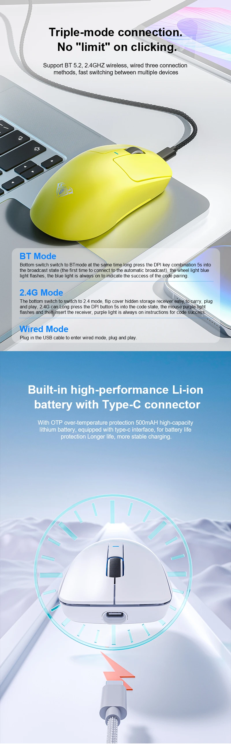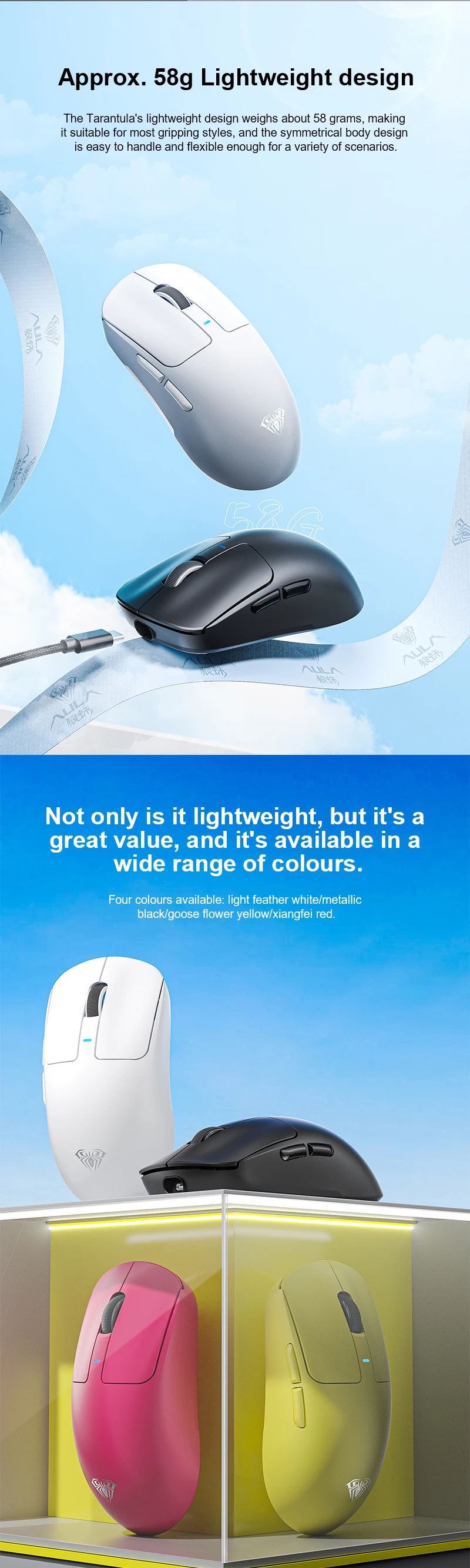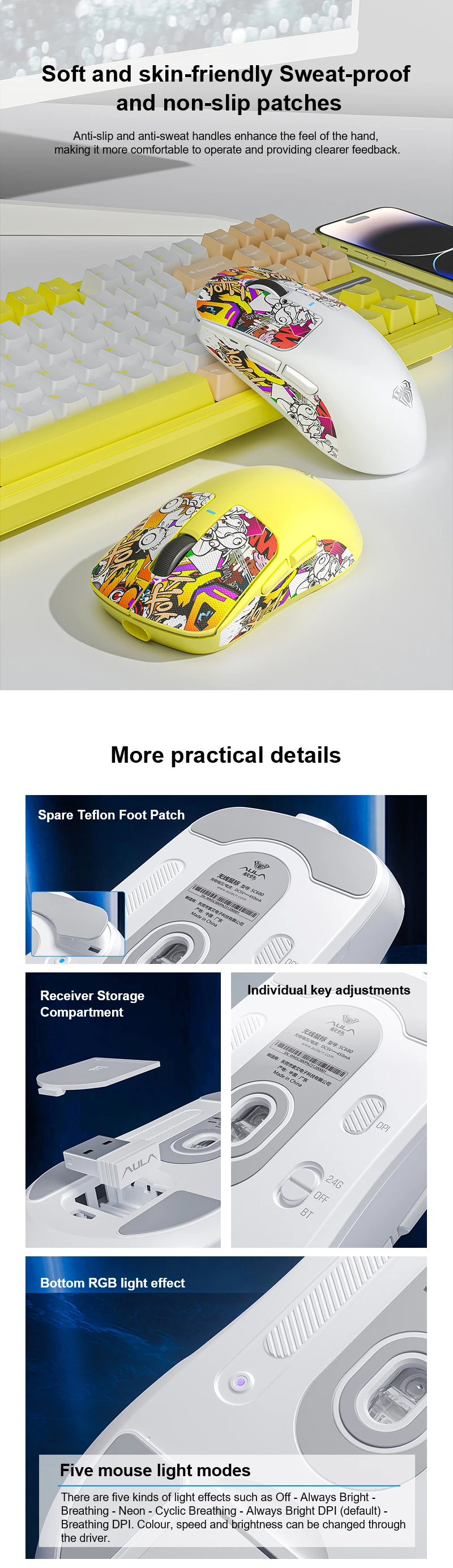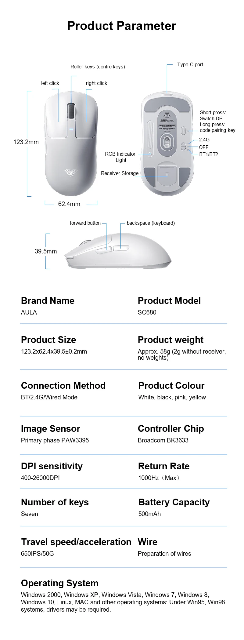 Ratón para juegos AULA SC680, ratón inalámbrico Bluetooth de tres modos 2,4G, ratón ligero de 26000DPI Paw3395 para jugadores de deportes electrónicos para PC