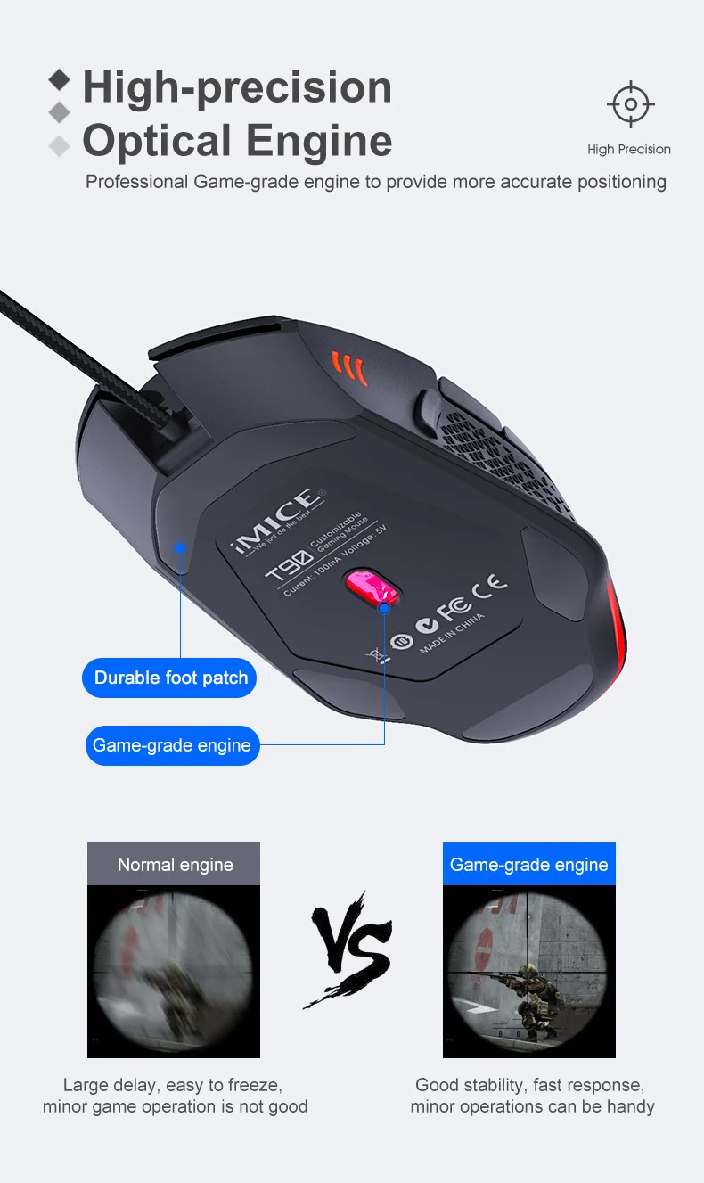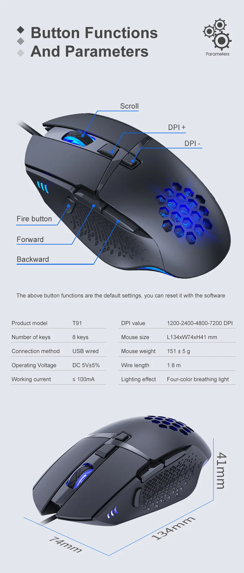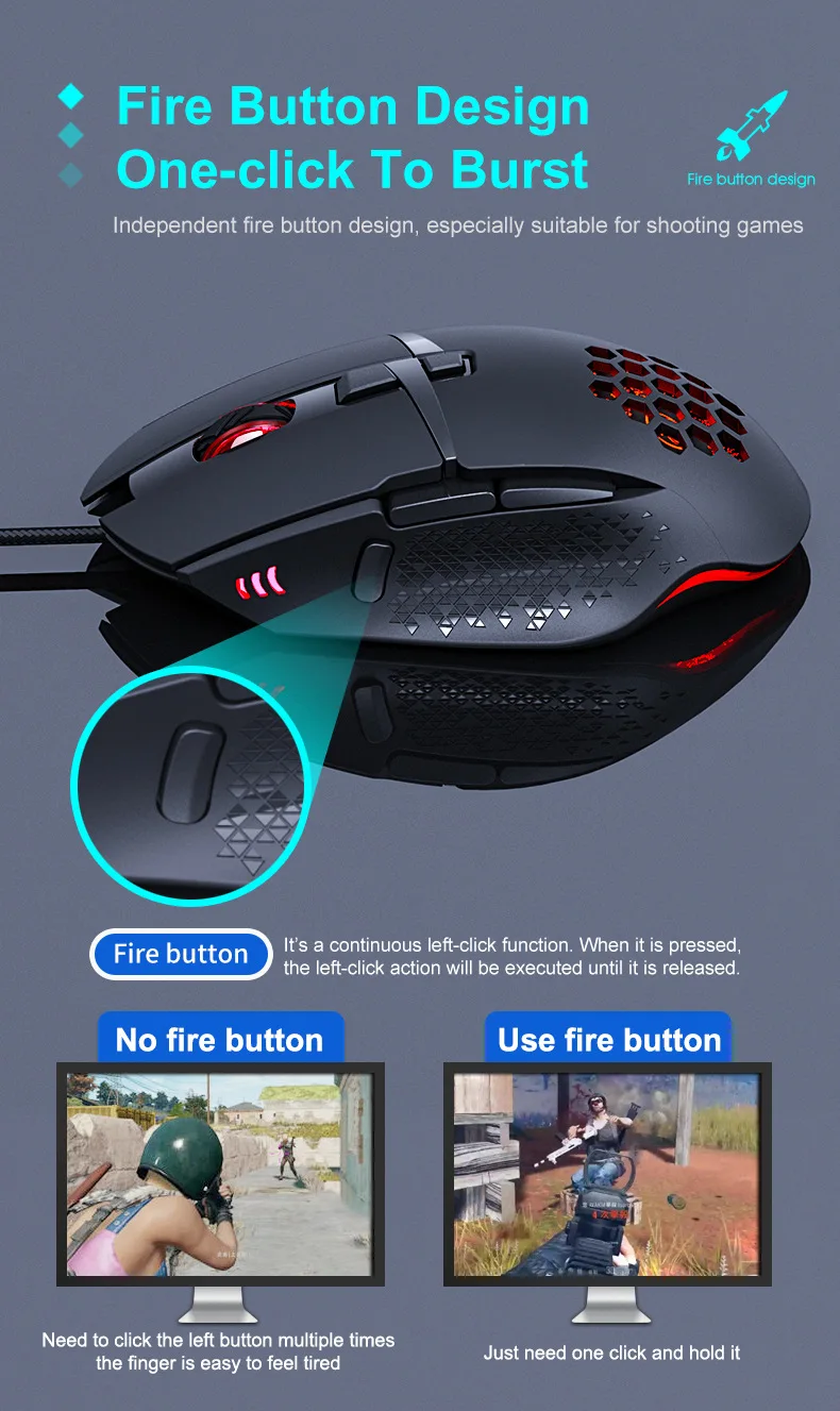 Ratón para juegos con cable Lingsheng T90 con programación macro Teclas de fuego luminosas de diseño hueco de 7200DPI para PC y portátiles