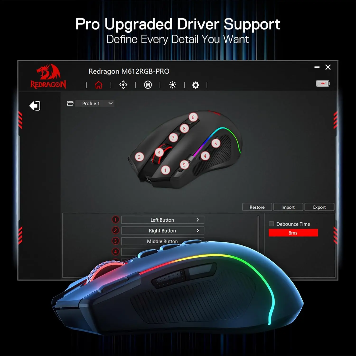 Comprar Ratón para juegos Redragon M612 PRO BT y 2,4RGB, ratón óptico para jugadores con cable/inalámbrico de 8000 DPI, 11 botones programables y 6 modos retroiluminados
