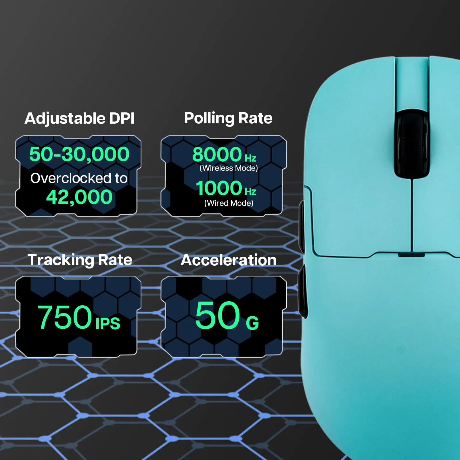 【Sensor PAW3950 rápido de 8 Khz】AJ159 APEX está equipado con el sensor óptico APEX amortiguador PAW3950 personalizado de AJAZZ, que logra una precisión y sensibilidad incomparables a través de 30K DPI (el overclocking puede alcanzar 42K DPI), 750 IPS y 50G.La tasa de sondeo de 8000 HZ le permite experimentar una precisión en tiempo real en modo inalámbrico, con hasta 8000 informes de datos por segundo, logrando una latencia mínima y un excelente rendimiento de juego.(1K con cable y 8K inalámbrico)