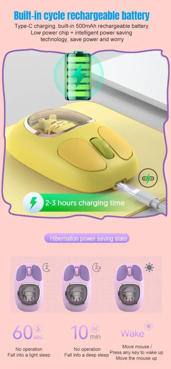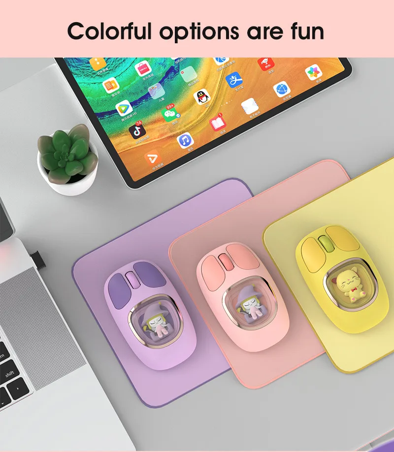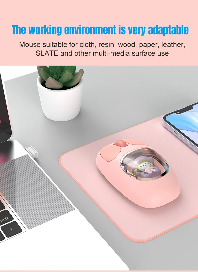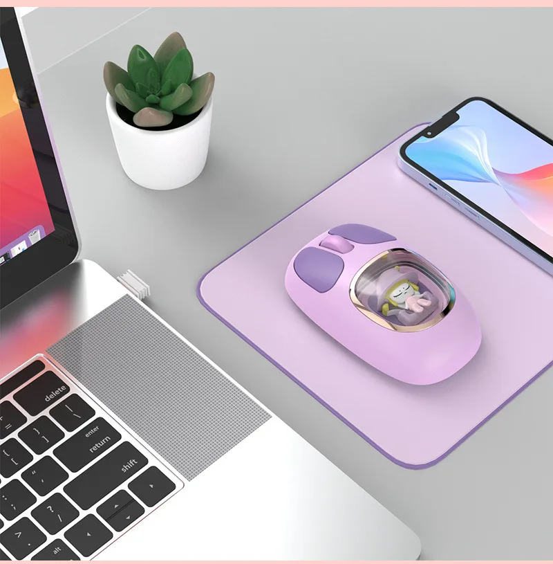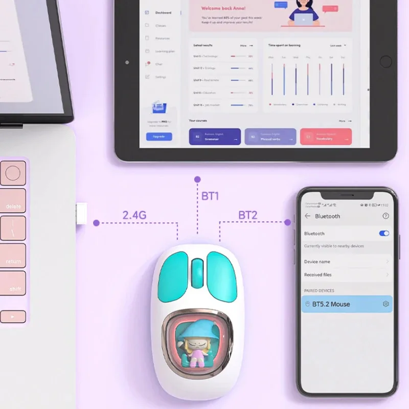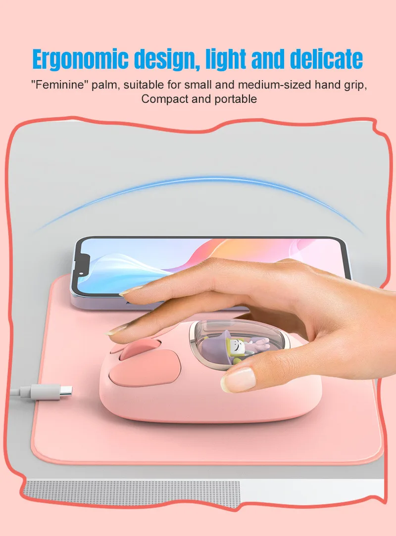 Bonita muñeca de dibujos animados transparente Bluetooth inalámbrico Tri-Mode ratón recargable retroiluminación botón mudo ratones para PC portátil