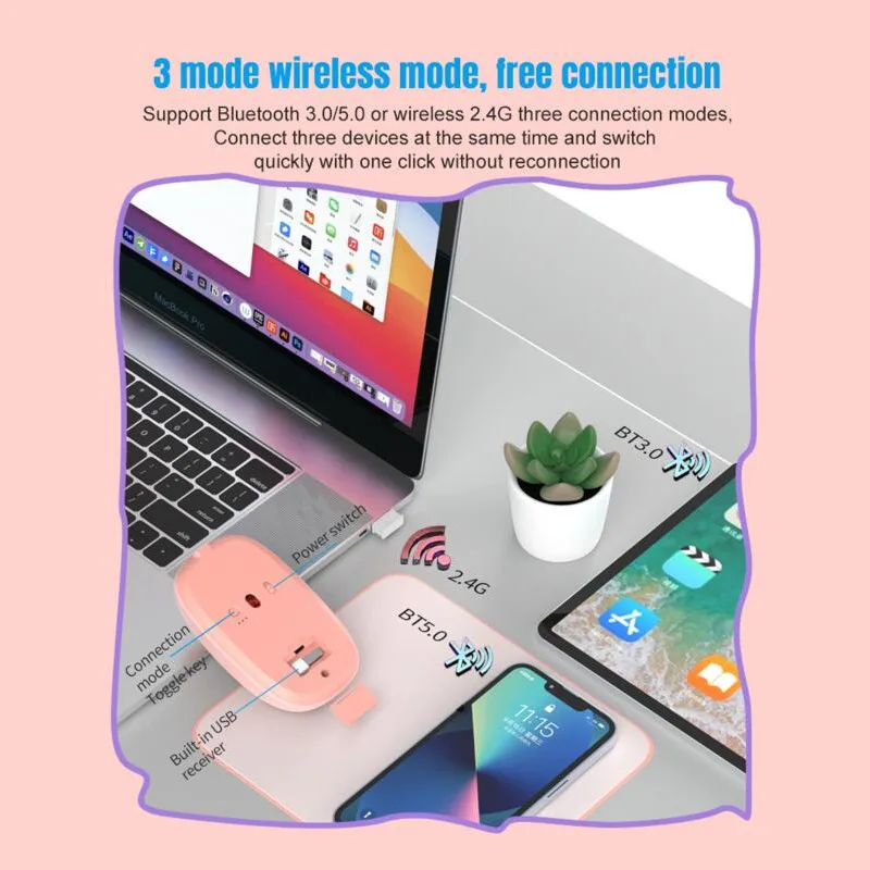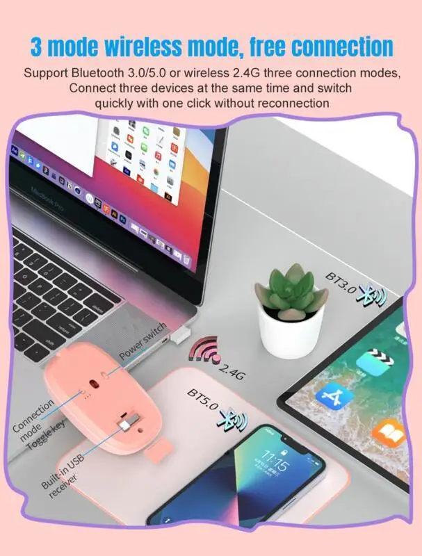 - Admite métodos de conexión Bluetooth 3.0/5,0 o inalámbrica 2.4G, lo que permite la conexión simultánea a tres dispositivos con conmutación rápida con un solo clic, sin necesidad de volver a conectarse.