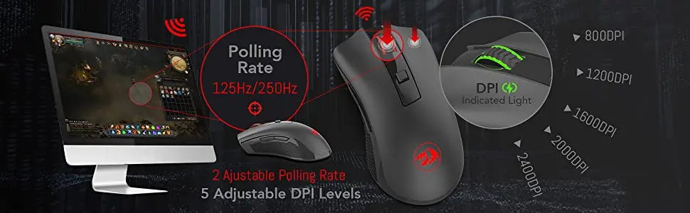 *5 Dpi ajustables y 2 velocidades de contaminación: DPI 800,1200,1600,2000,2400 se pueden cambiar fácilmente por orden para satisfacer sus necesidades.Velocidad de sondeo de 2 niveles: 125 Hz y 250 Hz se pueden cambiar según su actividad.El receptor USB Nano se puede guardar en la parte posterior del mouse, lo que permite un fácil almacenamiento cuando no se utiliza.No se requiere ningún controlador, solo conéctelo y juegue.