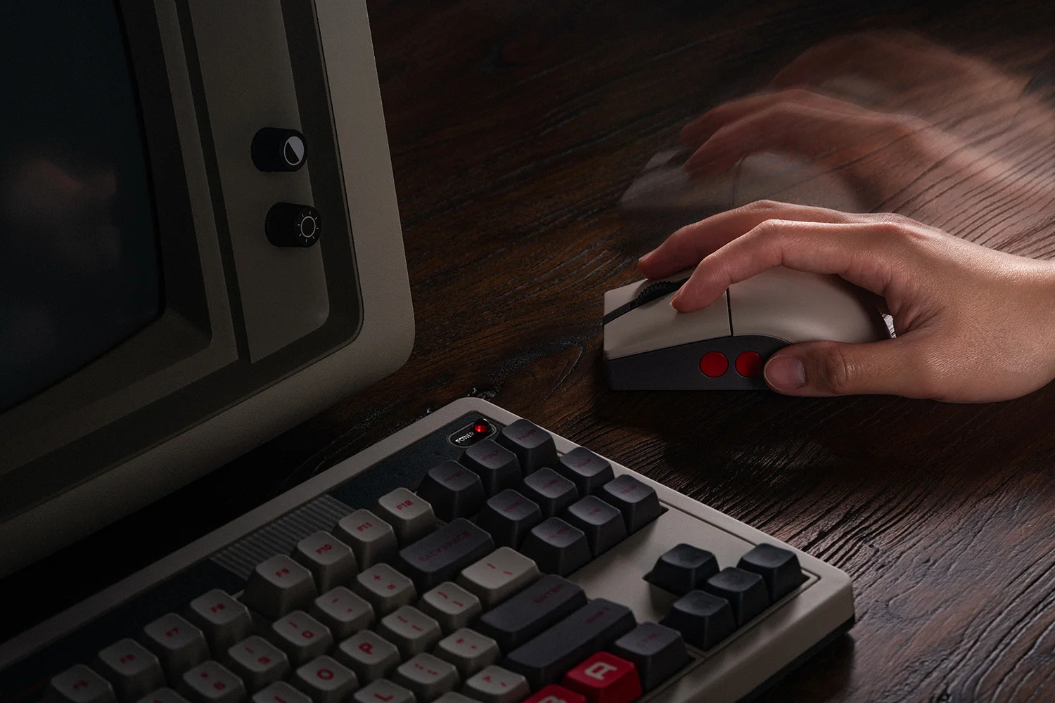 El mouse retro R8 y el teclado retro comparten un lenguaje de diseño unificado, creando una configuración de escritorio cohesiva y elegante. Se vende por separado.