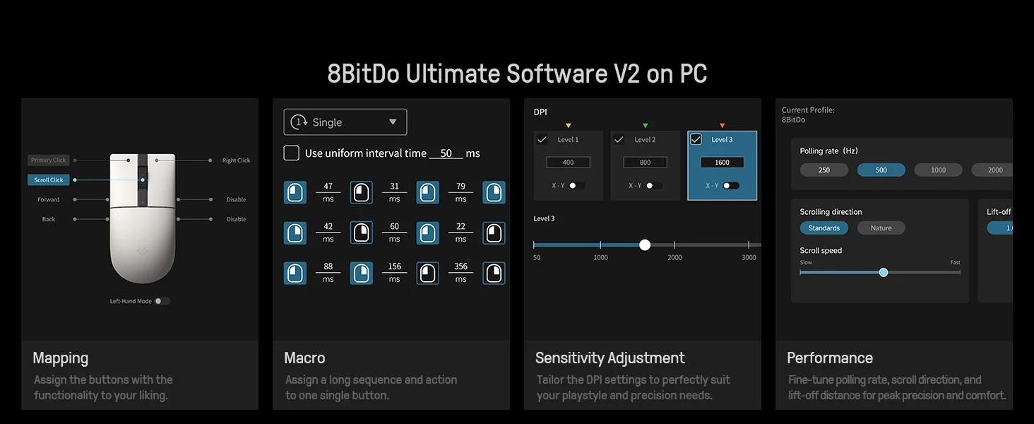 Optimizado tanto para el trabajo como para los juegos, el sensor PAW 3395 de alto rendimiento admite 6 niveles de sensibilidad de 50DPI a 26000DPI, con velocidades de sondeo que oscilan entre 125 Hz y 8000 Hz*, lo que garantiza un seguimiento y capacidad de respuesta precisos.