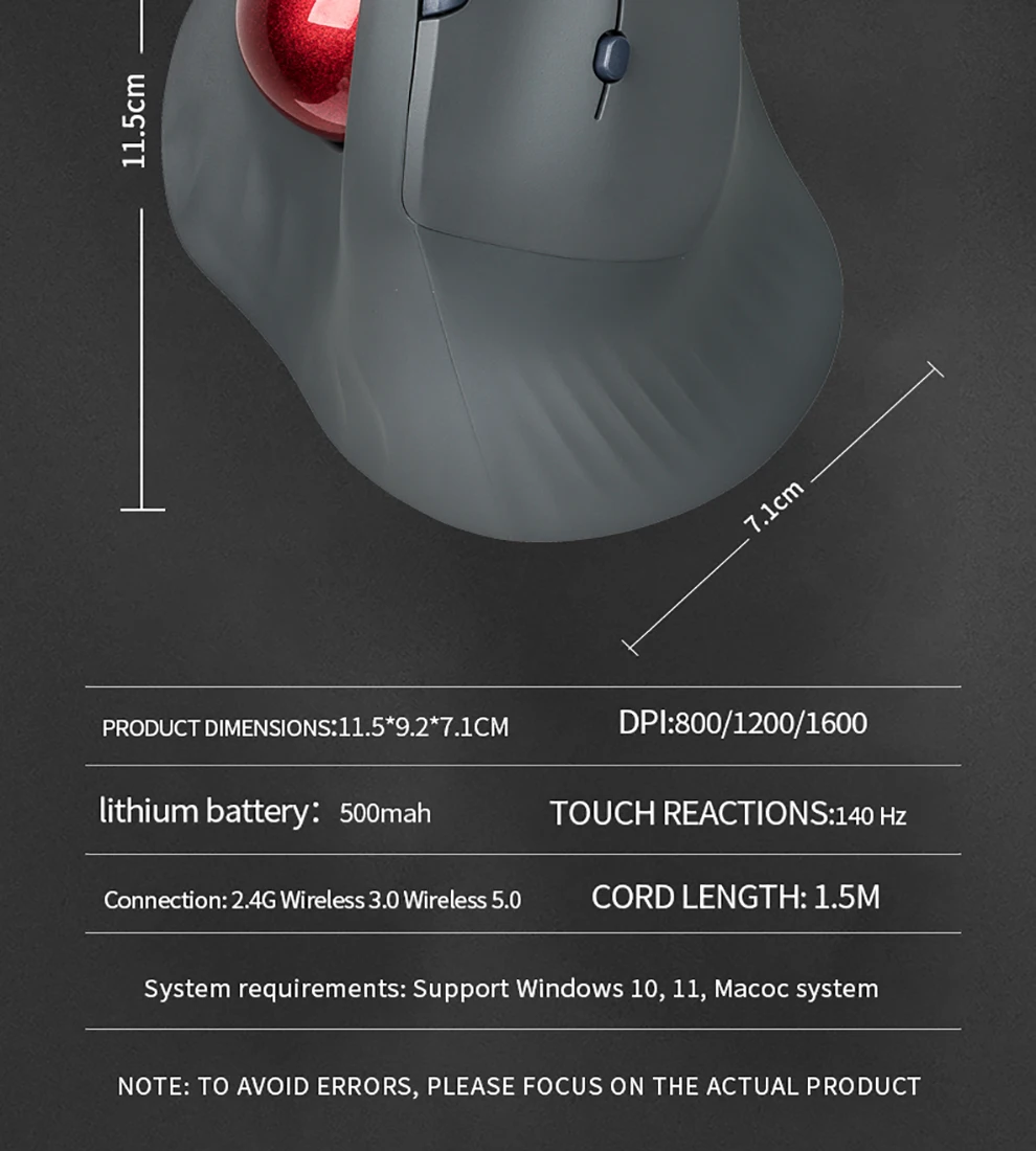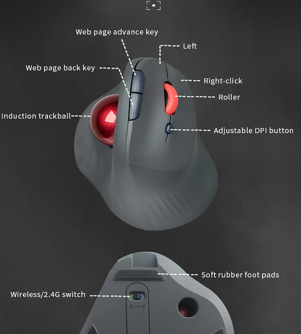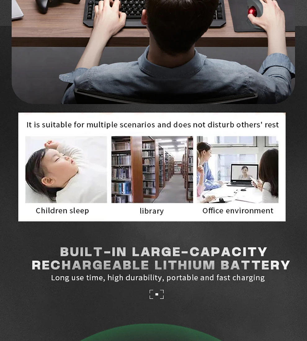 Clic silencioso: cuenta con un mecanismo de clic silencioso, lo que lo hace ideal para usar en entornos silenciosos como bibliotecas, oficinas o espacios compartidos.Batería recargable: (Para su mejor experiencia, cargue completamente el mouse trackball bluetooth antes de su primer uso) La batería recargable incorporada tiene una batería de larga duración que le permite decir adiós a las baterías de celda seca. Tenga en cuenta: 1. Utilice nuestro cable de carga incluido para cargar el mouse trackball inalámbrico 2. No utilice un cargador rápido para cargar el mouse trackball. (Utilice directamente el puerto USB de la computadora o un cargador de 5 V para cargar el mouse trackball bluetooth).