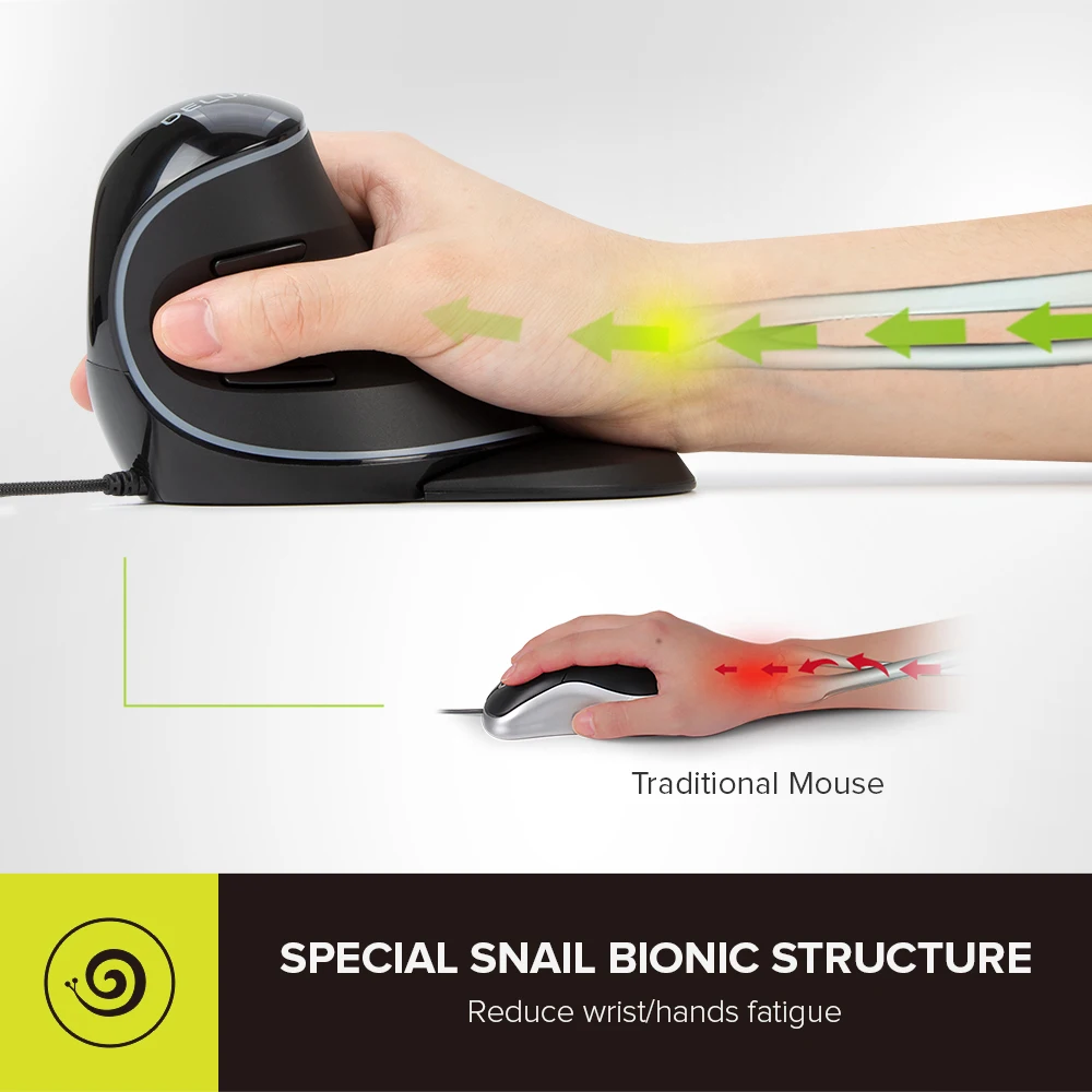 El exclusivo mouse vertical con un diseño biónico de voluta especial alivia las molestias y la rigidez del brazo.