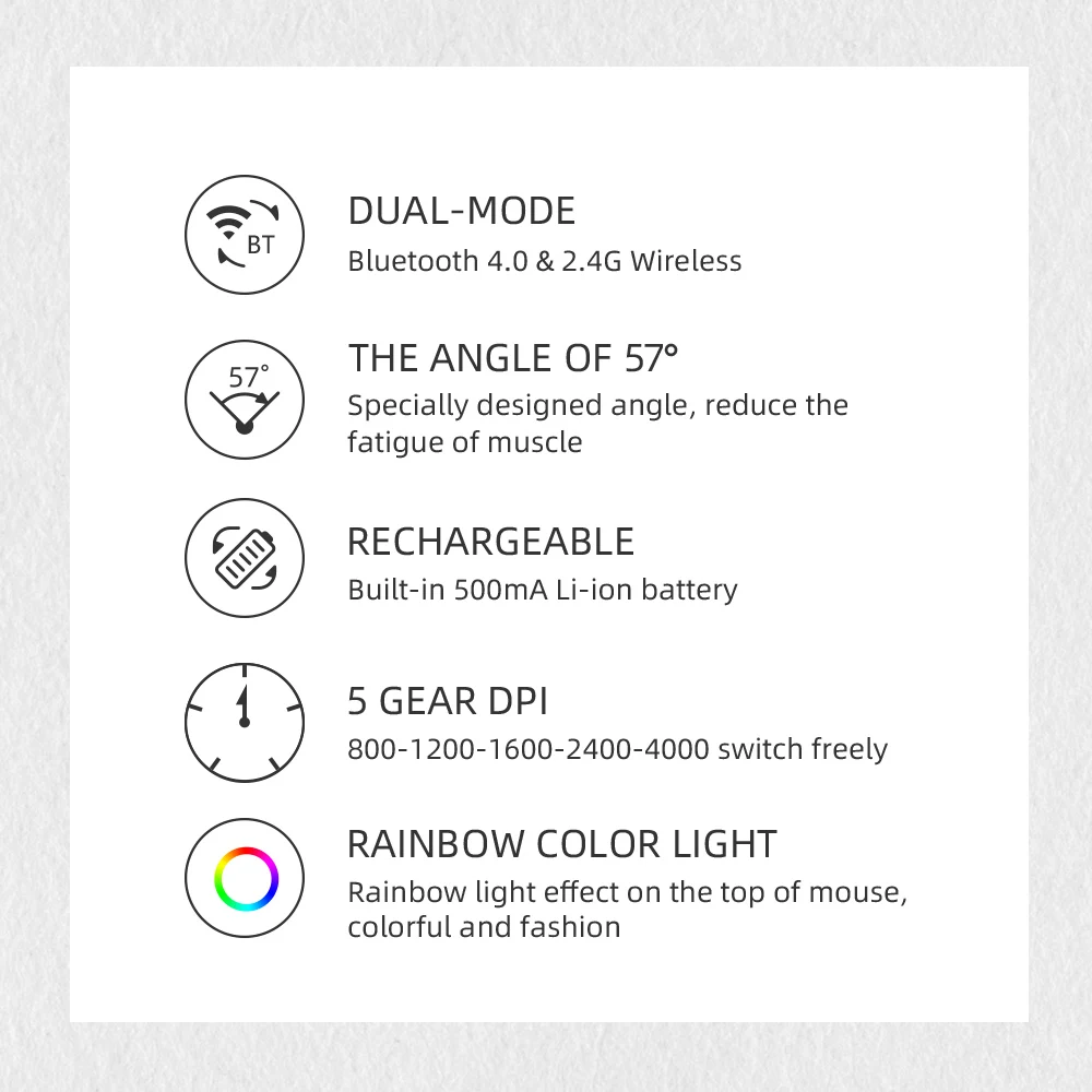 Construya la conexión a través de BT4.0 y receptor USB, conexión estable, plug and play.Y cambie fácilmente el modo de conexión entre 2.4G inalámbrico y BT haciendo clic en el pequeño punto en la parte inferior del mouse.