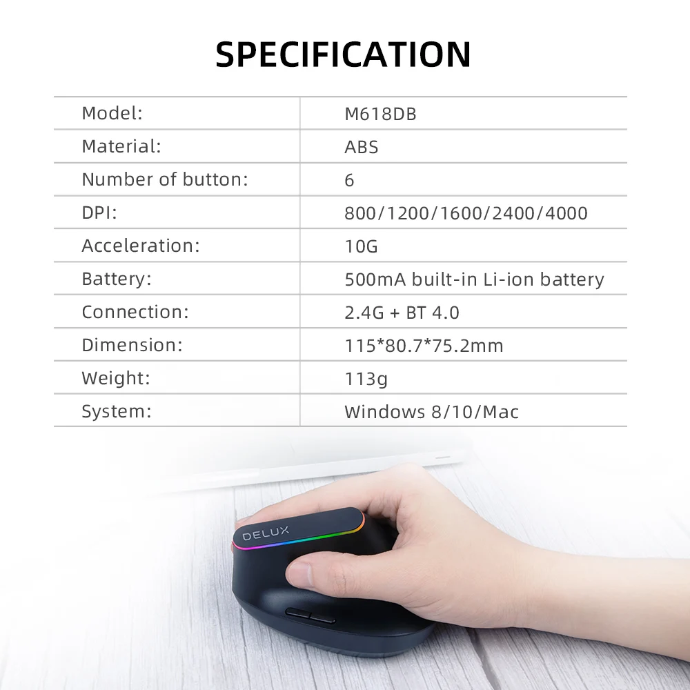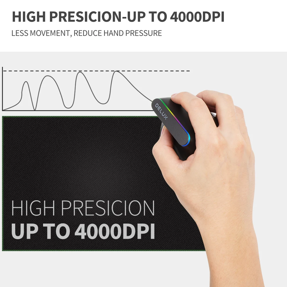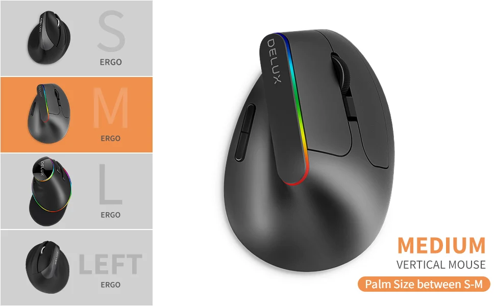 Simplemente sostenga el mouse vertical DELUX con un ángulo científico de 57 grados, apoye la mano en el mouse y mantenga el músculo del antebrazo en una posición natural.En comparación con el mouse con forma de tradición, reduce las molestias en los brazos y la rigidez de las manos.