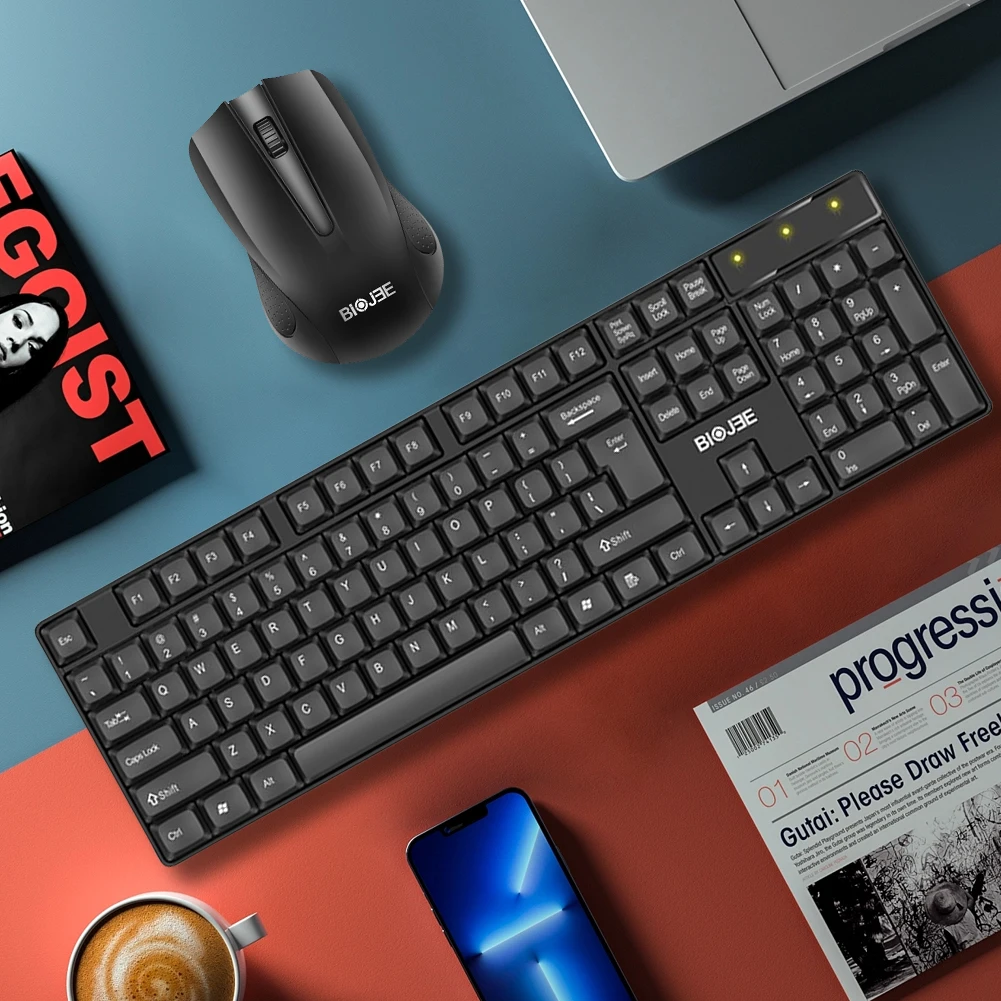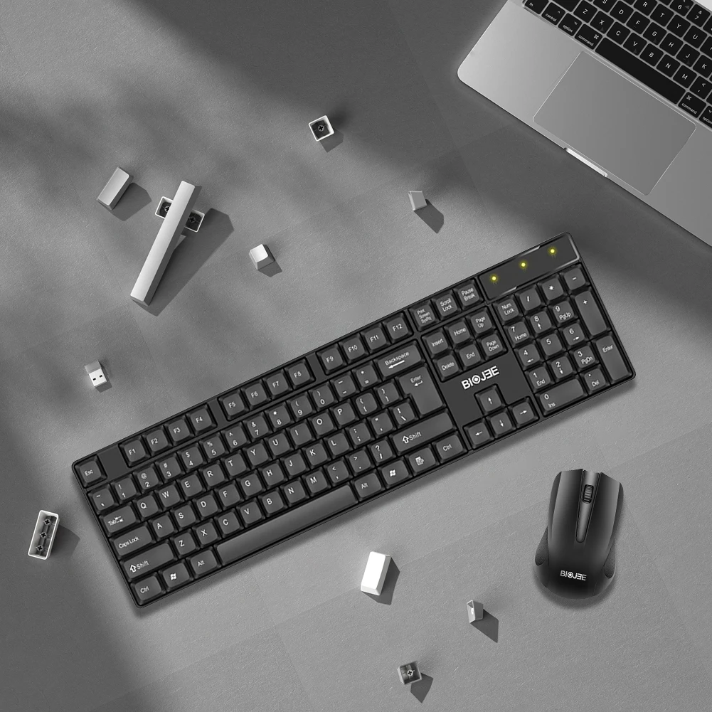5.Inalámbrico y eficiente:El juego de mouse y teclado de computadora inalámbrico externo ofrece una portabilidad sin complicaciones y un espacio de trabajo ordenado, alimentado por dos baterías AAA para el mouse y una batería AA para el teclado.