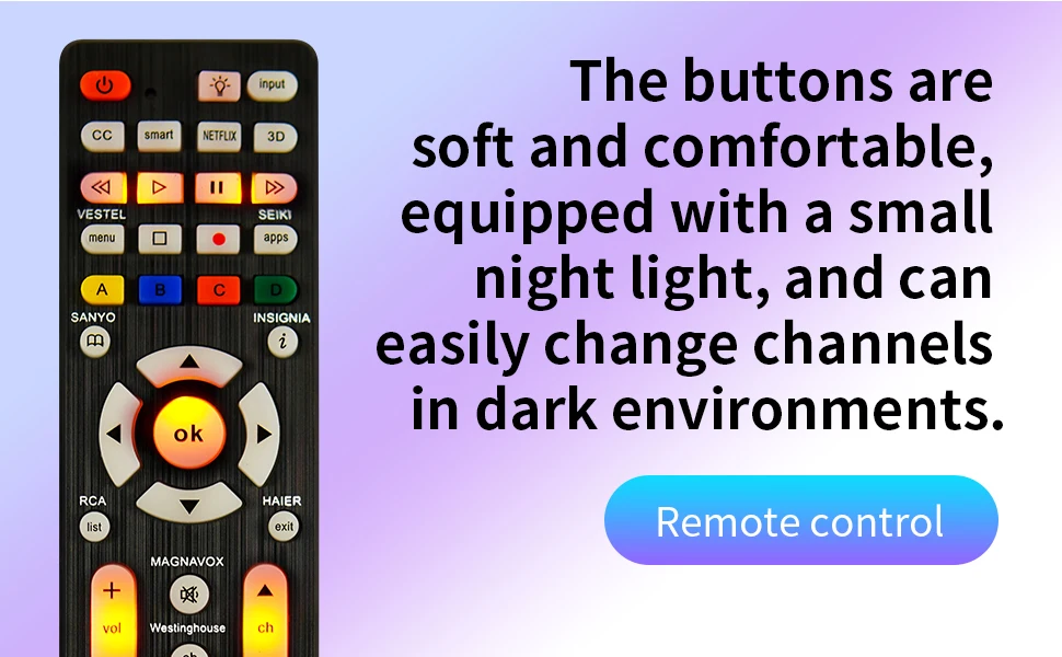 • Múltiples canales:El control remoto tiene un canal, lo que permite un control fácil y eficiente de su TV.