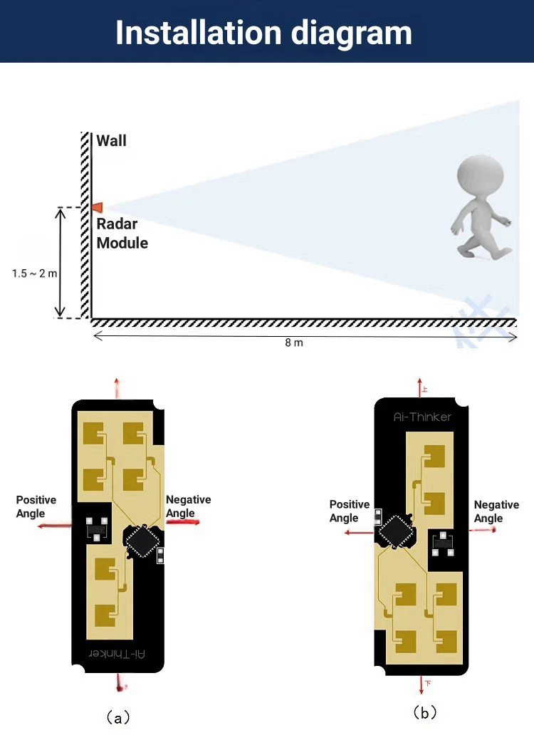 1. The recommended radar installation orientation is (a) or (b), the positive and negative directions are azimuth angles, the upand down directions are pitch angles, and the normal direction of the radar antenna plane is 0
