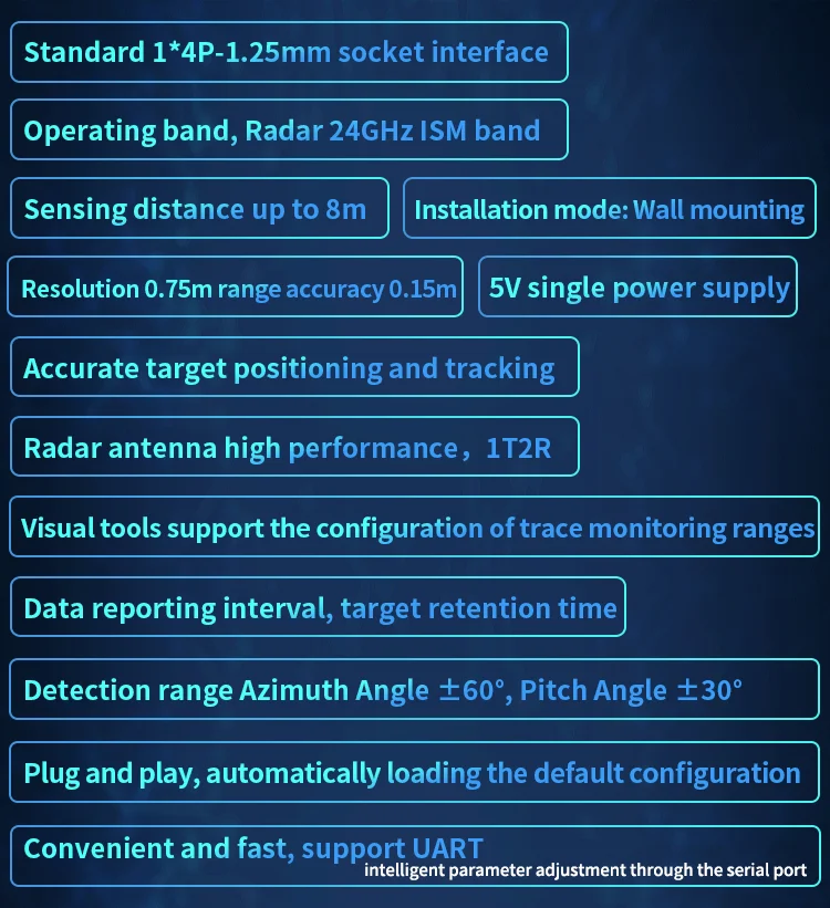 Characteristic:1. Adopts standard 1*4P-1.25mm socket connector2. Radar supports 24 GHz ISM frequency band3. High performance 1T2R antenna4. Accurate target positioning and tracking5. MAX sensing distance is 8m6. The range resolution is 0.75m, the ranging accuracy is 0.15m7. Detection range azimuth Angle ±60°, pitch Angle ±30° Wall mounting8. Provides a visual tool to configure the tracking detection range, data reporting interval, and target retention time9. Ultra-small module size: 15*44mm10. Automatically loads default configuration, plug and play11. Support UART, you can use the serial port to realize radar intelligent parameter adjustment, convenient and fast12. 5V single power supply13. Typical application scenarios:1*Smart home2*Smart business3*Bathroom4*Smart lighting