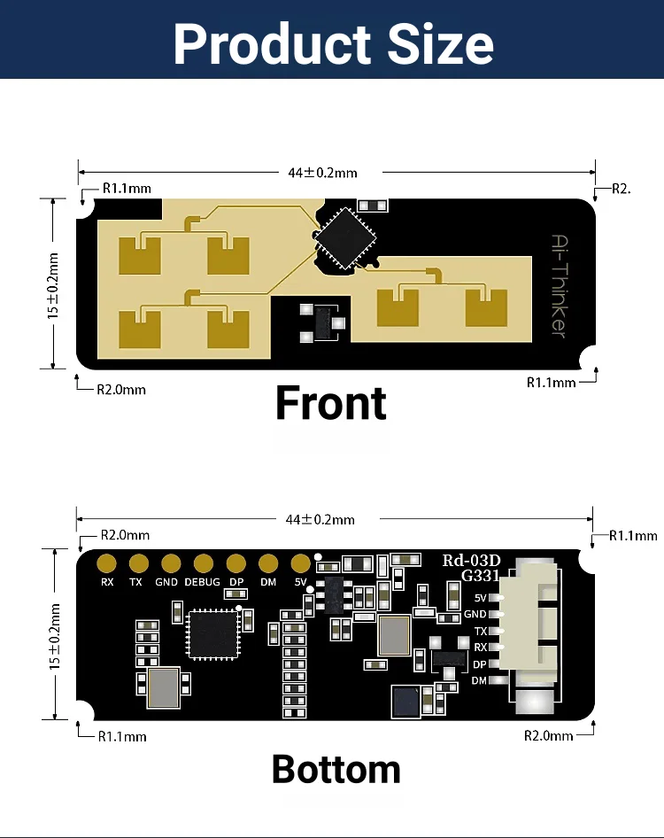 Rd-03D is a radar module equipped with Silicon Microelectronics' S5KM312CL chip. S5KM312CL is an integrated microcontroller millimeter wave sensor SoC based on FMCW radar transceiver technology. It operates in the 24 GHz K-band with a maximum sweep bandwidth of 0.25GHz. This module uses FMCW waveform and S5 series chip's proprietary advanced signal processing technology, combined with MCU's proprietary radar signal processing and built-in intelligent positioning and tracking algorithm, to detect multiple targets in a designated area and report the results in real time. Users can quickly Develop corresponding targeting tracking products.The Rd-03D module accurately senses the motion status of the human body and the area. It is equipped with an intelligent algorithm to realize motion trajectory recognition and tracking, and can measure the speed and distance of targets in the area. The recognition speed is faster and the power consumption is lower. The module can be quickly configured and is suitable for various publicity facilities. It can intelligently distinguish the human body in motion, micro-motion and stillness, and control the switch of the equipment. This module has good resistance to external interference and is not affected by wireless signals such as WIFI.