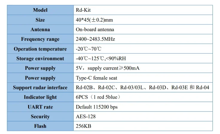Model Rd-03D Package Standard 1*4P-1.25mm socket connector Size 15.0*44.0(±0.2)mm Antenna on-board PCB antenna Frequency 24G ~24.25GHz Working temperature -40℃ ~ 85℃ Storage temperature -40℃ ~ 125℃, 90%RH Power supply Support voltage 5V, supply current ≥200mA Interface UART UART rate Default 256000 bps