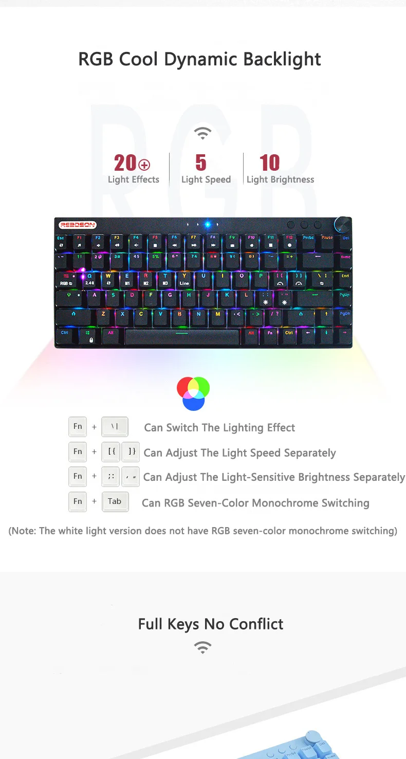 Modo de conexión: 2,4G inalámbrico + Bluetooth + cable USB Luz blanca de tres modos dos opciones