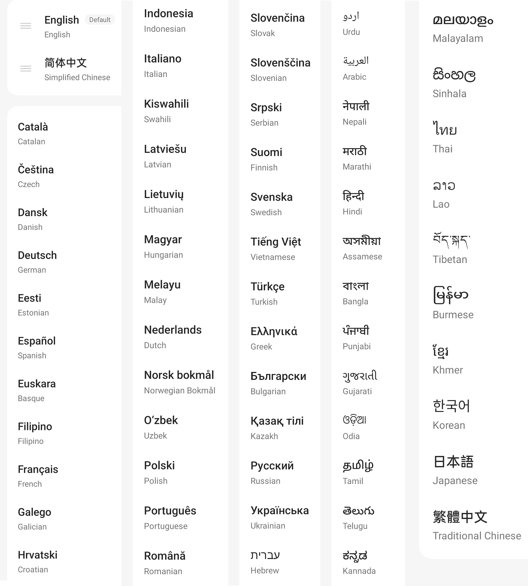 Catalán, checo, danés, alemán, estonio,Inglés, Español, Euskera, filipino,FrancésGallego, croata, Indonesio, italiano, swahili, letón, lituano, húngaro, malayo, neerlandés, noruego, uzbeko,Polaco, Portugués, Rumano, eslovaco, esloveno, serbio, finlandés, sueco, vietnamita, turco, griego, búlgaro, kazajo,Ruso, ucraniano, hebreo, Urdu, árabe, nepalí, Marathi, hindi, asamés, bengalí, punjabi, gujarati, Odia, Tamil, Telugu, kannada, malayalam, cingalés, tailandés, laosiano, tibetano, birmano, khmer,Coreano, japonésChino tradicional.