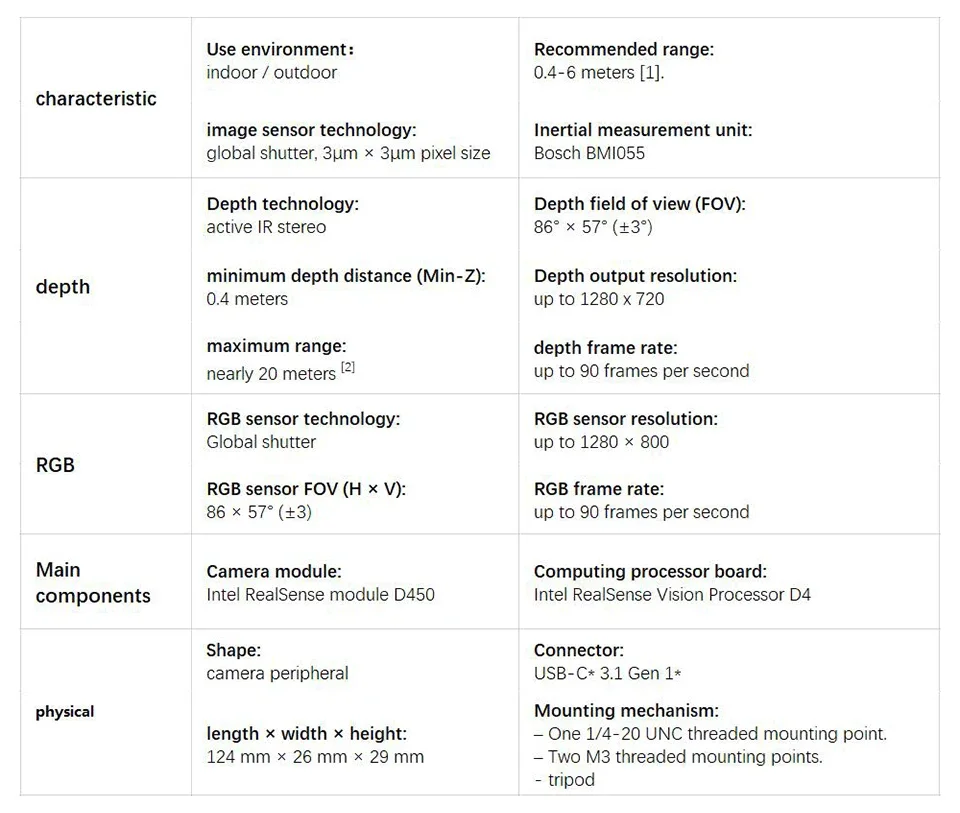 La Intel® RealSense™ La cámara de la serie D400 tiene un diseño portátil que es fácil de instalar, admite resolución de alta profundidad e incluye un sensor de profundidad estéreo infrarrojo activo con campo de visión estándar o amplio.Para aplicaciones de alta precisión, elija D415 con persiana enrollable.Si se trata de una escena de aplicación en movimiento rápido o en exteriores, elija una cámara D435 o D435i con obturador global.