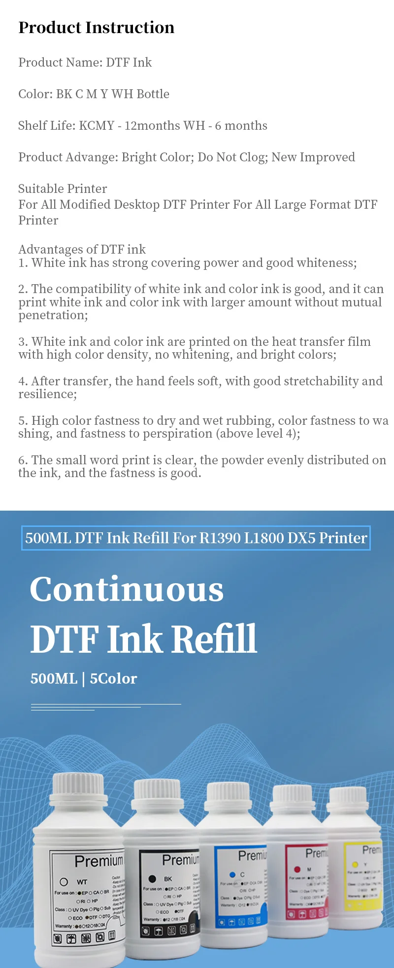 Comprar Recarga de tinta DTF de 5 colores, 500ML, para impresora de transferencia R1390, L1800, DX5, existencias en EE. UU.