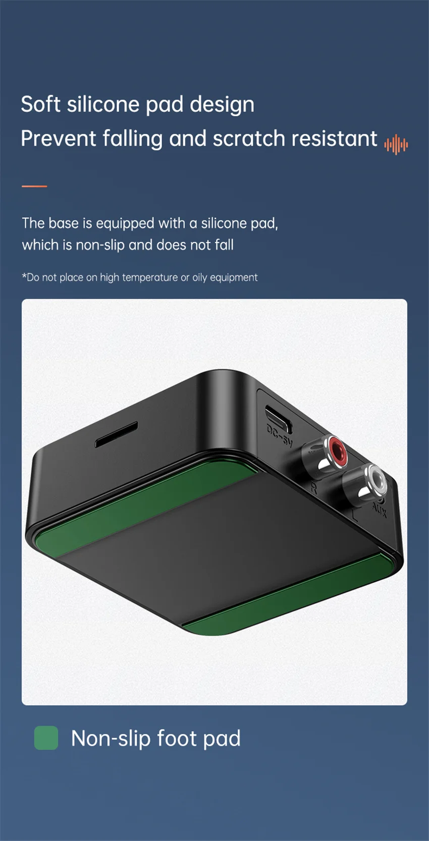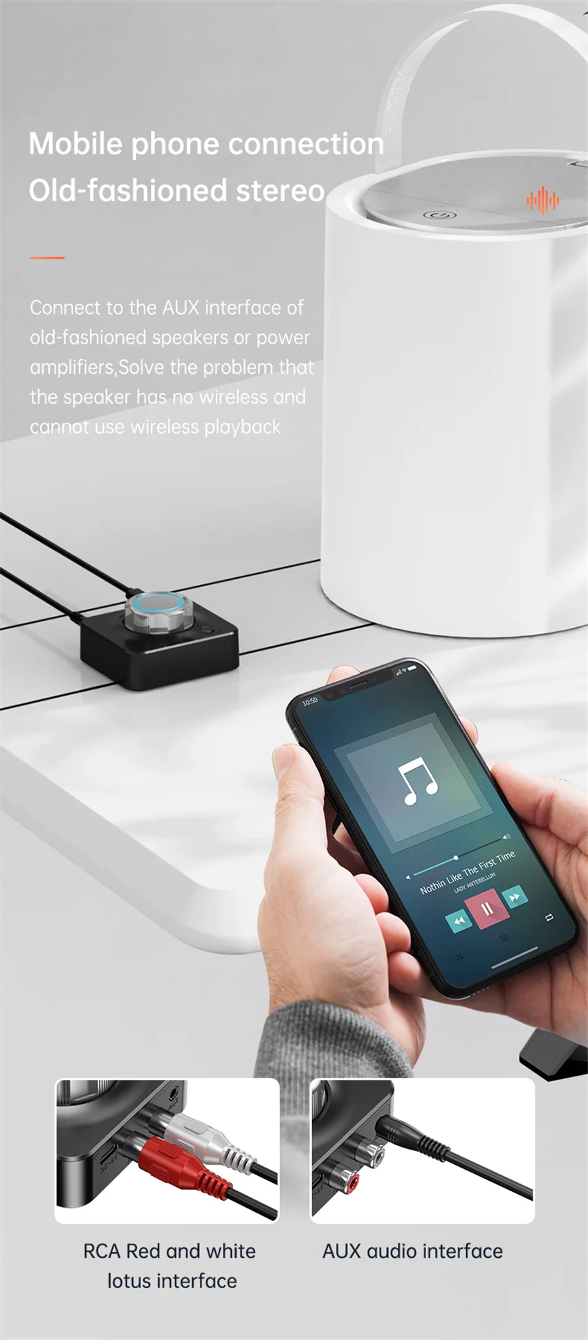 7. Conexión súper estable: nuestro adaptador de audio Bluetooth está equipado con un chip Bluetooth 5.0 para un emparejamiento constante, transmisión rápida y un amplio rango de señal (33 pies).Con el puerto AUX de 3,5 mm y 2 puertos RCA, se puede conectar a sistemas de audio para automóvil que no sean Bluetooth, estéreo doméstico, auriculares/altavoces con cable, amplificador/cine en casa, etc.¡Entonces podrás disfrutar de la transmisión inalámbrica de música Hi-Fi!Nota: Es sólo un receptor VAORLO Bluetooth, no un transmisor.Por lo tanto, no puedes usarlo para tu televisor, teclado o ratón.
